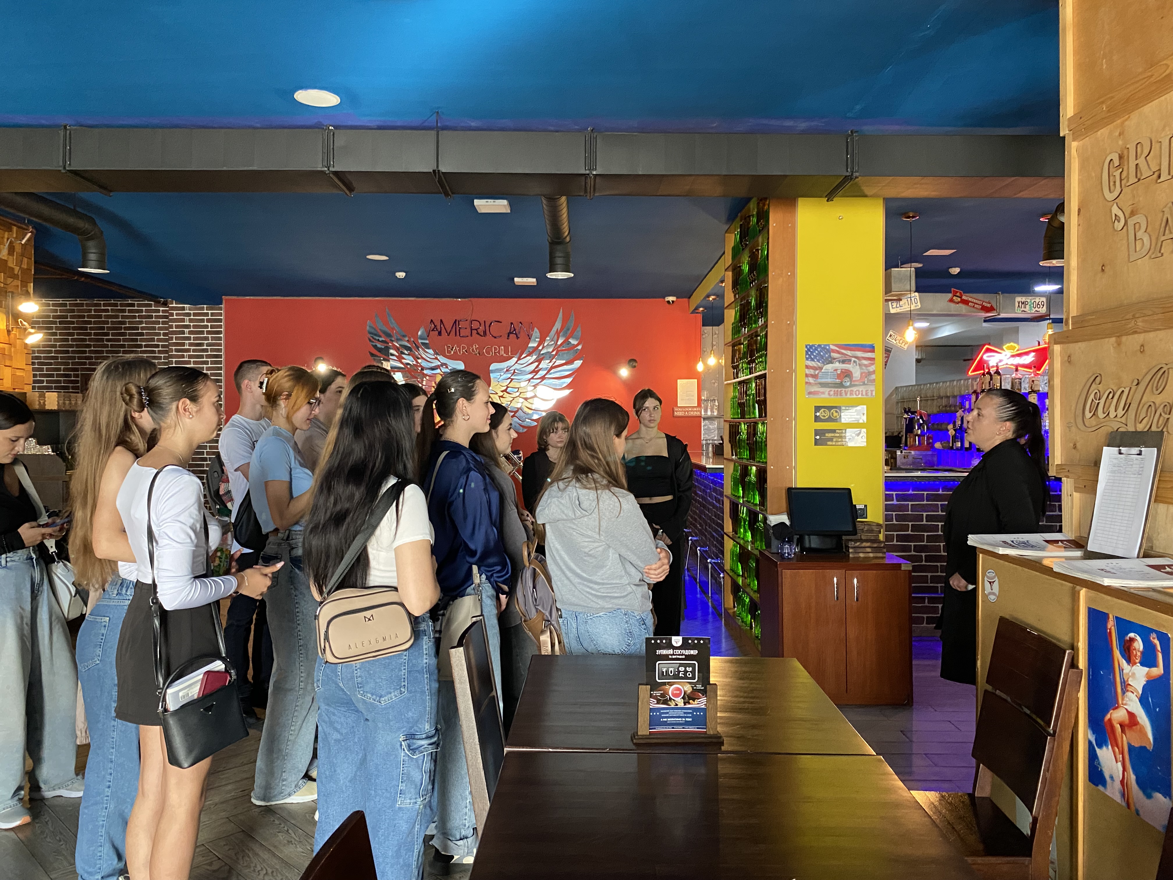 Здобувачі вищої освіти оглянули готель (номерний фонд, конференц-зали, ресторан, рецепцію), ознайомилися із персоналом та мали можливість поставити питання працівникам готельного закладу. Здобувачам вищої освіти барменом American Bar&Grill проведено майстер-клас по приготуванню кави.