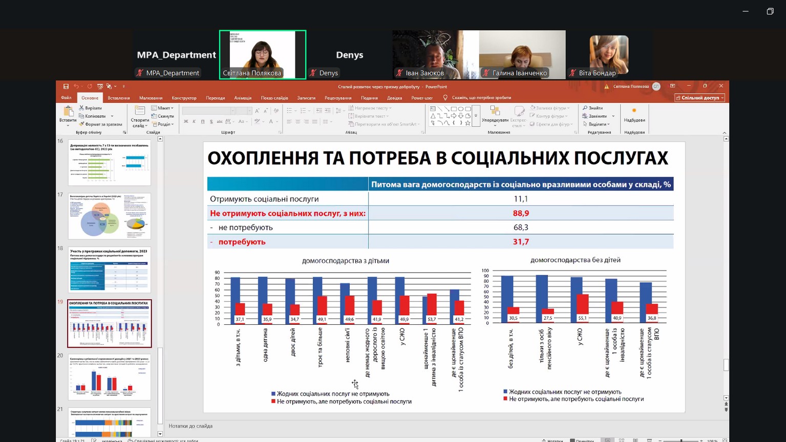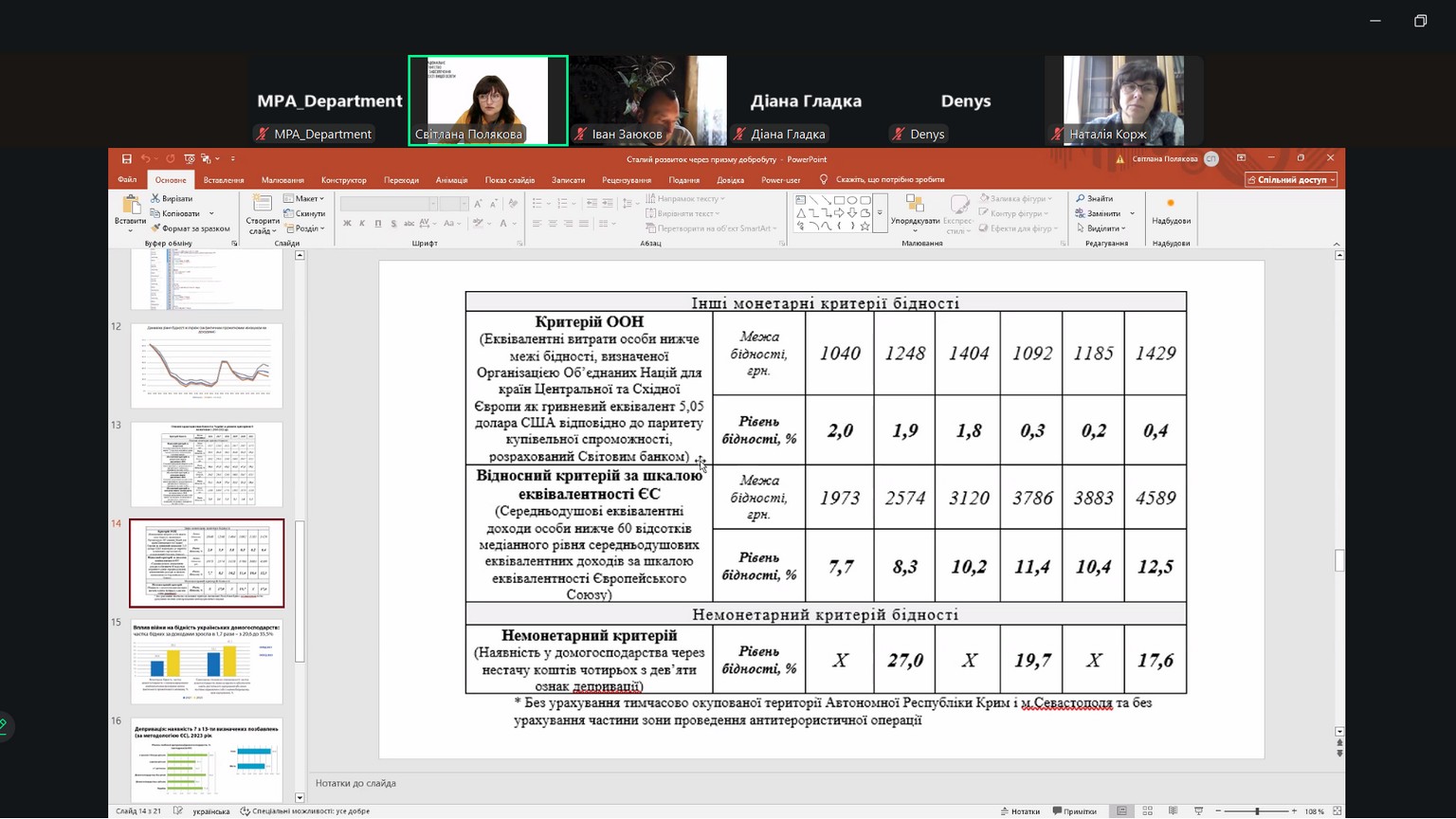 Провідний науковий співробітник відділу поведінкової економіки Інституту демографії та досліджень якості життя імені Михайла Птухи НАН України Світлана Полякова провела майстер-клас для здобувачів вищої освіти ВТЕІ ДТЕУ. В теоретичній частині майстер-класу спікер наголосила на проблемі бідності в Україні, основних характеристиках (показниках) бідності, зокрема в сучасних військових умовах; на наукових дослідженнях в системі загальнодержавного вибіркового обстеження соціально-економічного стану домогосподарств України, зокрема здійснено наголос на особливостях розрахунків та використанні економіко-математичних моделей; участі домогосподарств у програмах соціальної допомоги; охопленні і потребах в соціальних послугах в сучасних військових умовах; самооцінці купівельної спроможності домогосподарств; структурі сукупних витрат українських родин; впливові війни на бідність українських домогосподарств.