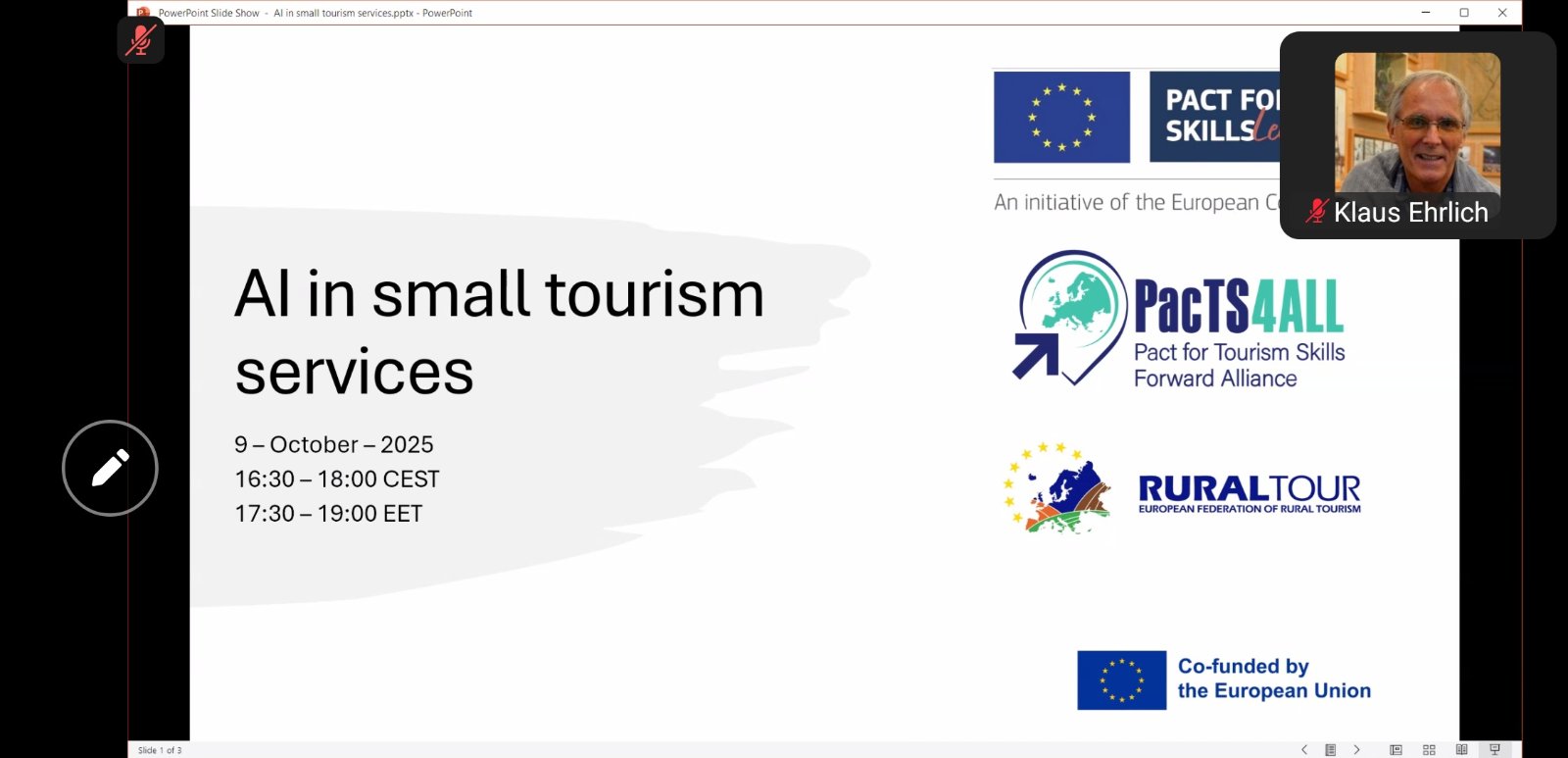 9 жовтня 2025 року науково-педагогічні працівники кафедри туризму та готельно-ресторанної справи, здобувачі вищої освіти за спеціальностями J3 Туризм і рекреація, J2 Готельно-ресторанна справа та кейтеринг взяли участь в онлайн-вебінарі «ШІ в туристичних послугах», організованому Європейською федерацією сільського туризму Ruraltour у межах ініціатив PacTS4ALL та Pact for Skills Tourism LSP та розробленому для мікро-, нано- та само зайнятих провайдерів туристичних послуг у сфері розміщення та суміжних із ними.