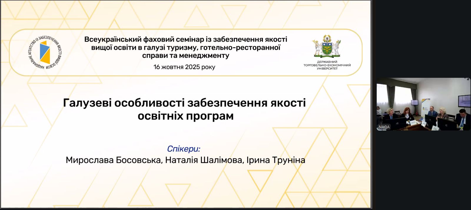 16 жовтня 2025 року на базі Державного торговельно-економічного університету відбувся Всеукраїнський фаховий семінар із забезпечення якості вищої освіти в галузі туризму, готельно-ресторанної справи та менеджменту, організований та проведений спільно з Національним агентством із забезпечення якості вищої освіти.