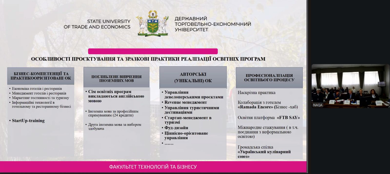 До участі у заході в змішаному форматі долучилися представники ВТЕІ ДТЕУ: д-р істор. наук, професор, завідувач кафедри туризму та готельно-ресторанної справи Наталія Чорна (очно), науково-педагогічні працівники кафедри туризму та готельно-ресторанної справи, гаранти освітніх програм за спеціальностями J2 Готельно-ресторанна справа та кейтеринг (доц. Ірина Мазуркевич, доц. Марина Рябенька), J3 Туризм і рекреація (доц. Алла Кізюн, доц. Наталя Онищук) (онлайн).
