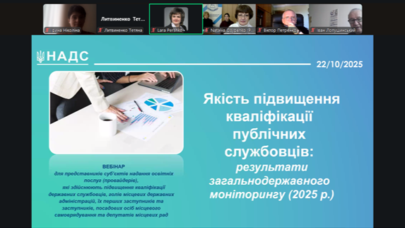 22 жовтня 2025 року науково-педагогічні працівники кафедри менеджменту та публічного управління — Галина Іванченко, Наталя Махначова та Ірина Ніколіна — взяли участь у вебінарі «Якість підвищення кваліфікації публічних службовців: результати загальнодержавного моніторингу (2025 р.)».