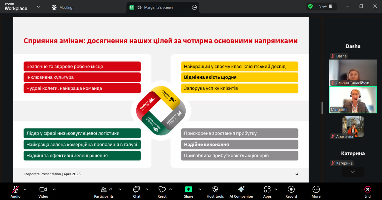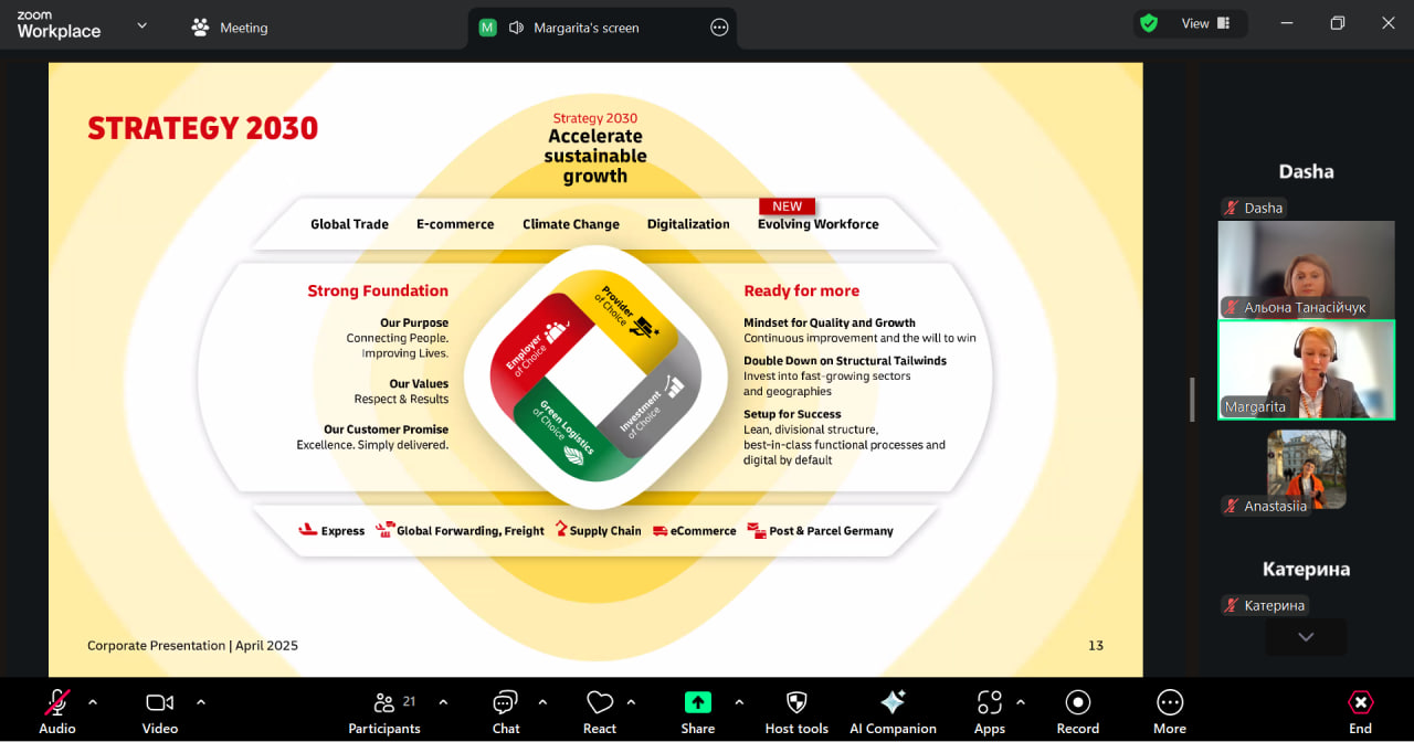 Під час зустрічі спікерка поділилася досвідом роботи у міжнародній логістичній компанії, розповіла про особливості організації клієнтських операцій у європейському підрозділі DHL Express, підходи до управління якістю сервісу та комунікації з клієнтами.