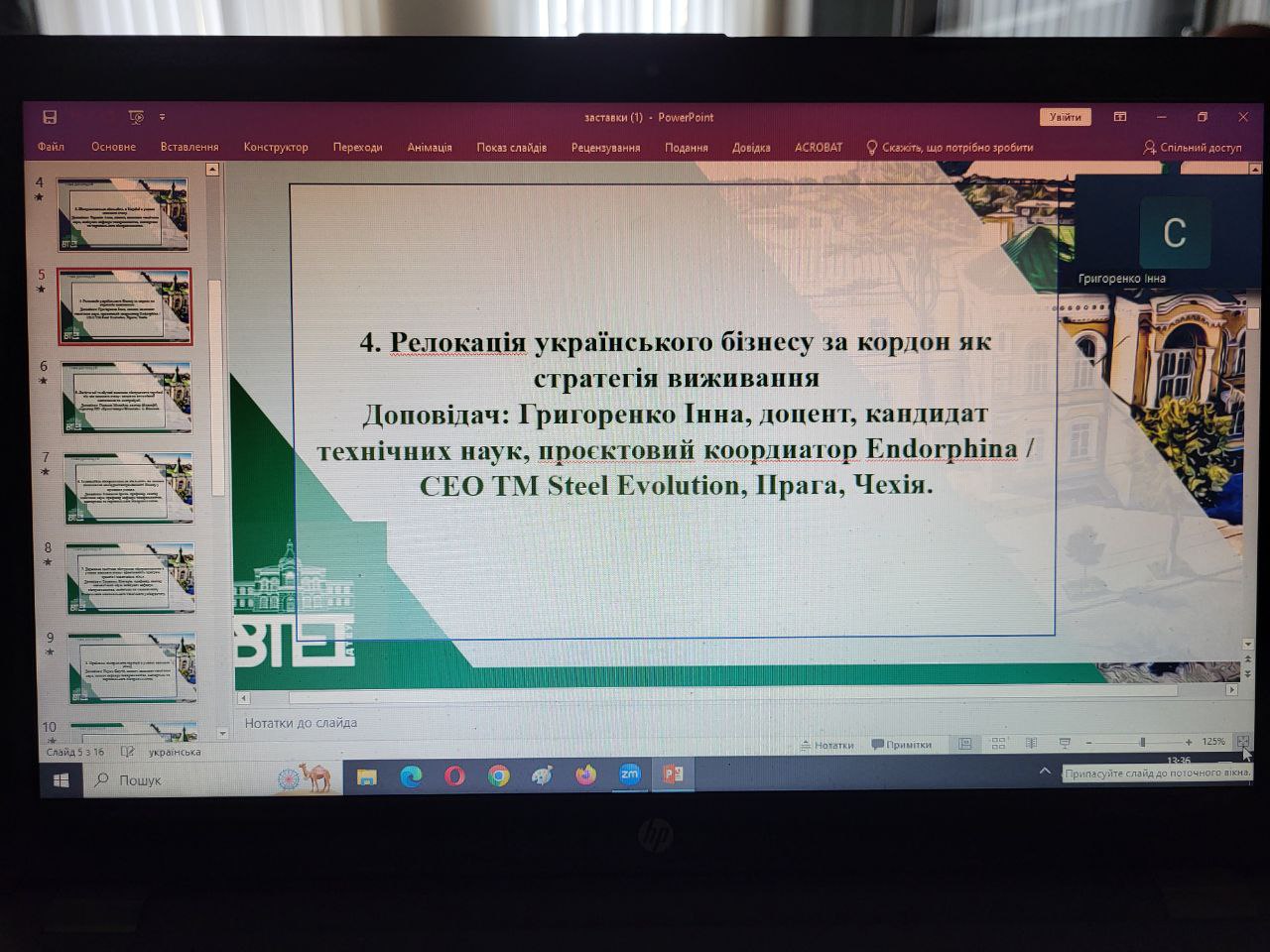 4. Релокація українського бізнесу за кордон як стратегія виживання Доповідач: Григоренко Інна, доцент, кандидат технічних наук, проєктовий коордиатор Endorphina / СЕО TM Steel Evolution, Прага, Чехія.