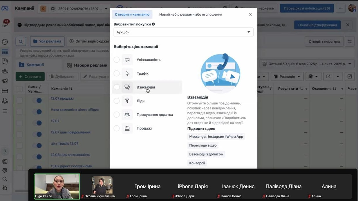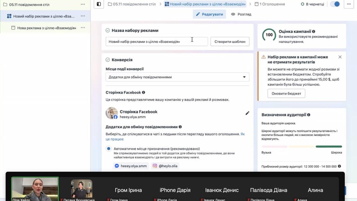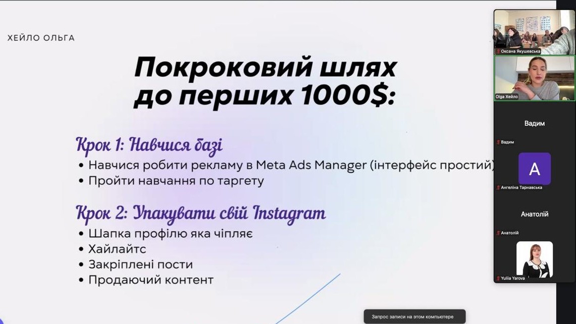 Протягом трьох днів Ольга Хейло, таргетолог і експерт з продажів – поділилася реальними кейсами, порадами та покроковими інструкціями зі створення рекламних кампаній у Facebook та Instagram. Здобувачі вищої освіти дізналися: