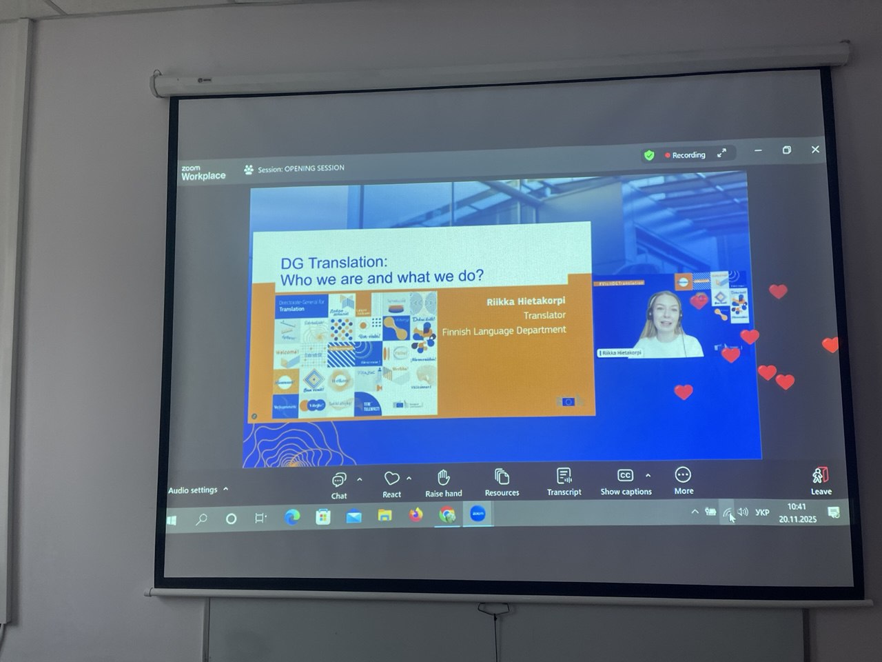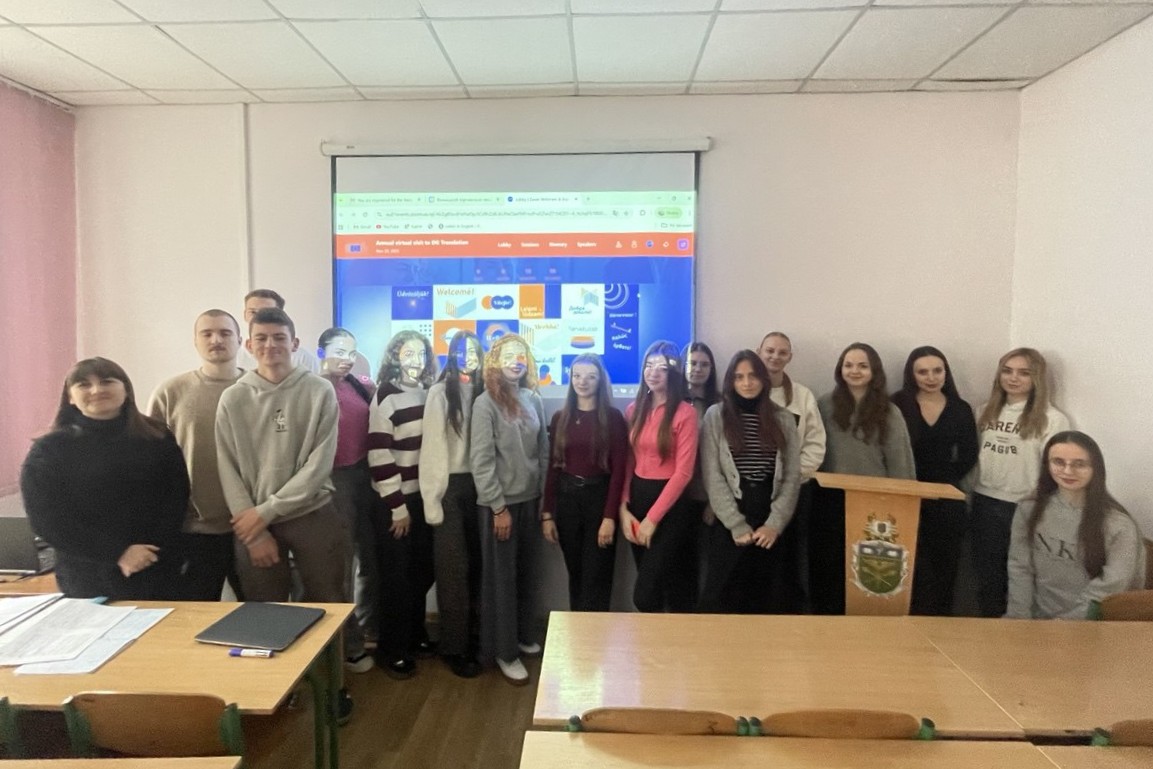 20 листопада 2025 року здобувачі вищої освіти, які навчаються за ОП «Германські мови та літератури (переклад включно)», та доцент кафедри Лілія Терещенко взяли участь у щорічному віртуальному візиті до Генерального директорату перекладу Європейської комісії. Учасники дізналися про щоденну роботу перекладачів Європейської комісії, сучасні перекладацькі інструменти та методи, що застосовуються в DG Translation, основні навички, необхідні мовним фахівцям інституцій ЄС, а також про різноманітні профілі перекладацьких посад та можливості стажування і працевлаштування.