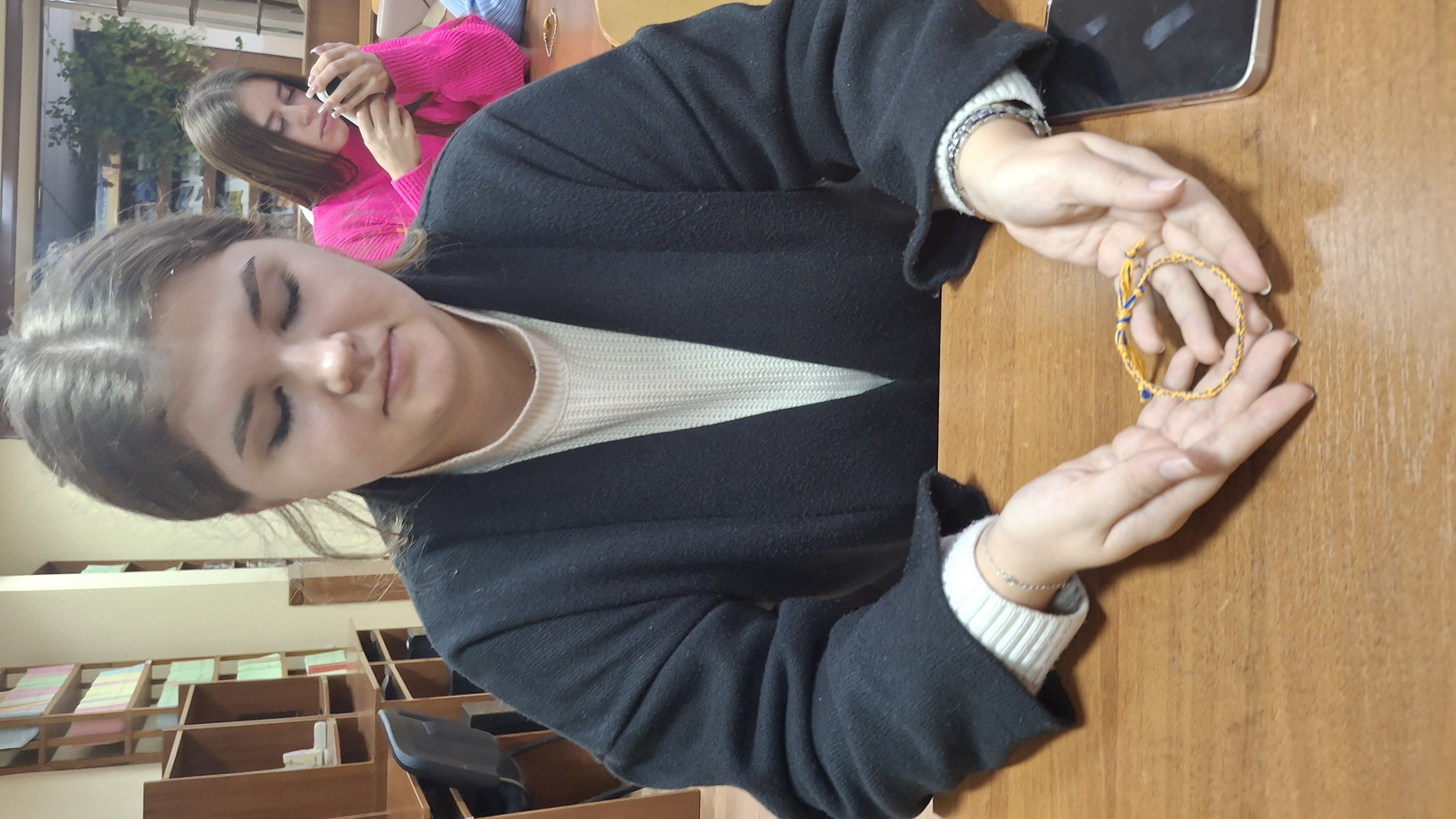 Учасники майстер-класу дізналися, що куміхімо – стародавнє ремесло, складні схеми та прийоми якого передавались в усній формі членами сімей та гільдій, щоб зберегти їх у таємниці. Майстриня наголосила на тому, що куміхімо, сплетені з ниток певних кольорів, вважалися оберегами і талісманами, що приносять удачу. А сам процес плетіння заряджає позитивною енергією. Тому для створення браслетів-оберегів були обрані жовтий і синій кольори. До процесу плетіння браслетів студенти поставилися сумлінно, захід пройшов у теплій та дружній атмосфері.