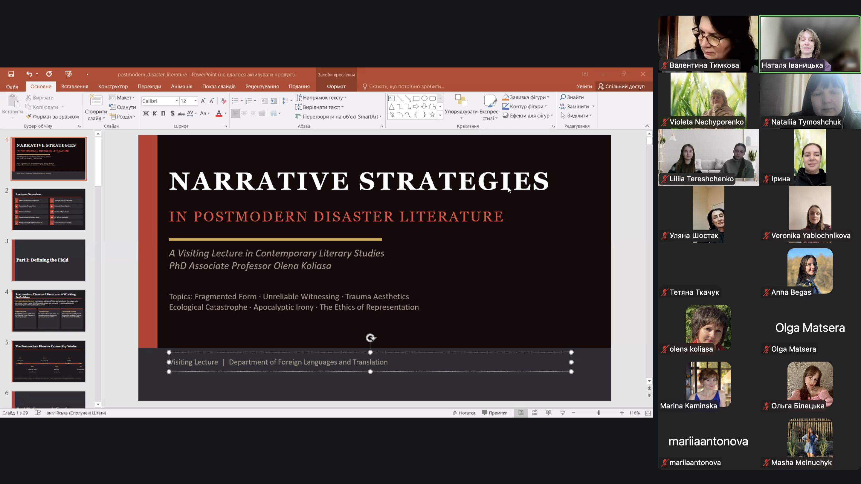 Під час лекції було розглянуто теоретико-методологічні підходи до аналізу постмодерного художнього тексту, окреслено специфіку репрезентації катастрофічного досвіду та трансформацію традиційних оповідних моделей у сучасному англомовному літературному дискурсі. Особливу увагу приділено таким рисам постмодерного письма, як фрагментарність, інтертекстуальність і нелінійність наративу.