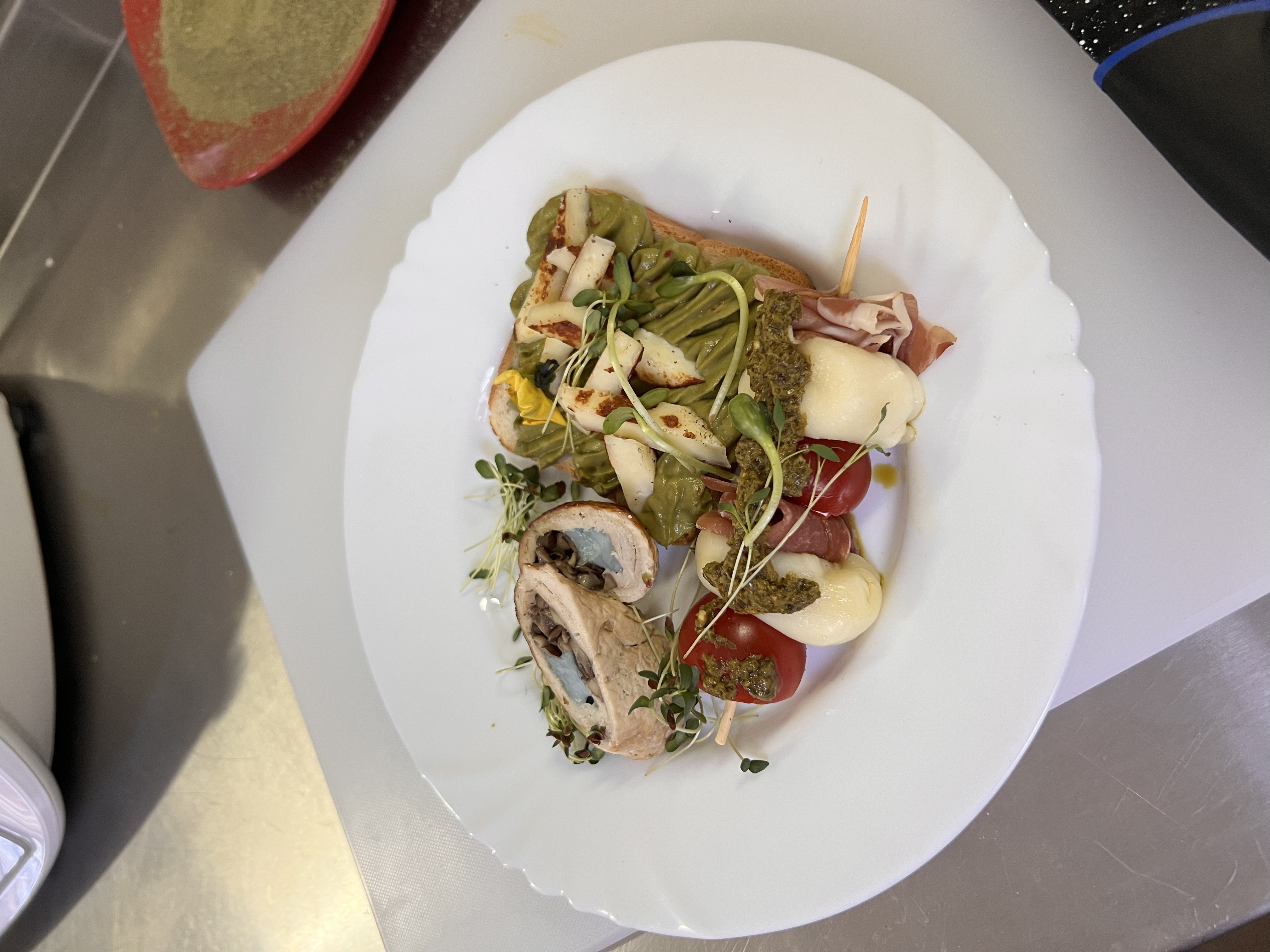 - закуску чері з копченою моцарелою бебі, що поєднує в собі солодкість томатів, димні нотки сиру та вишуканість італійського м’яса;