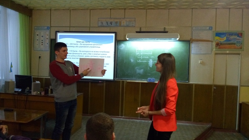 Під час тренінгу учням було проведено міні-лекцію «Моя професія – фінансист», тестування на здатність ведення фінансової та підприємницької діяльності, психологічний практикум. Учні проявили свої творчі вміння та навички під час виконання завдання «Намалюй емблему фінансиста» та брали активну участь у тренінгу. По закінченню усі учасники були нагороджені подяками.