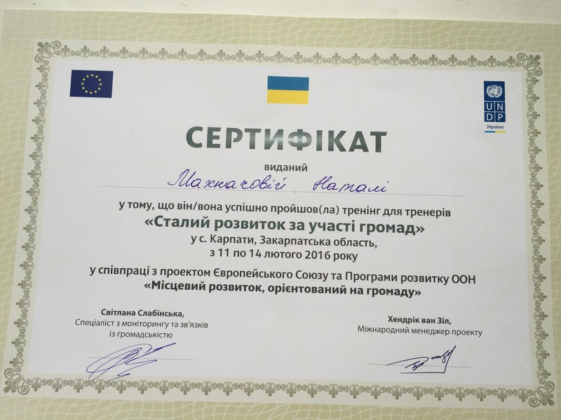 11-14 лютого 2016 року в с. Карпати Закарпатської області відбувся тренінг для тренерів із курсу «Сталий розвиток за участі громад». Тренінг було організовано в рамках співпраці спільного проекту ПРООН/ЄС «Місцевий розвиток, орієнтований на громаду» (МРГ) із ВНЗ України. Захід відкрила Світлана Слабінська, спеціаліст з моніторингу та зв’язків із громадськістю проекту МРГ, а модераторами тренінгу виступили Ганна Аладжальян і Тетяна Кузнєцова.