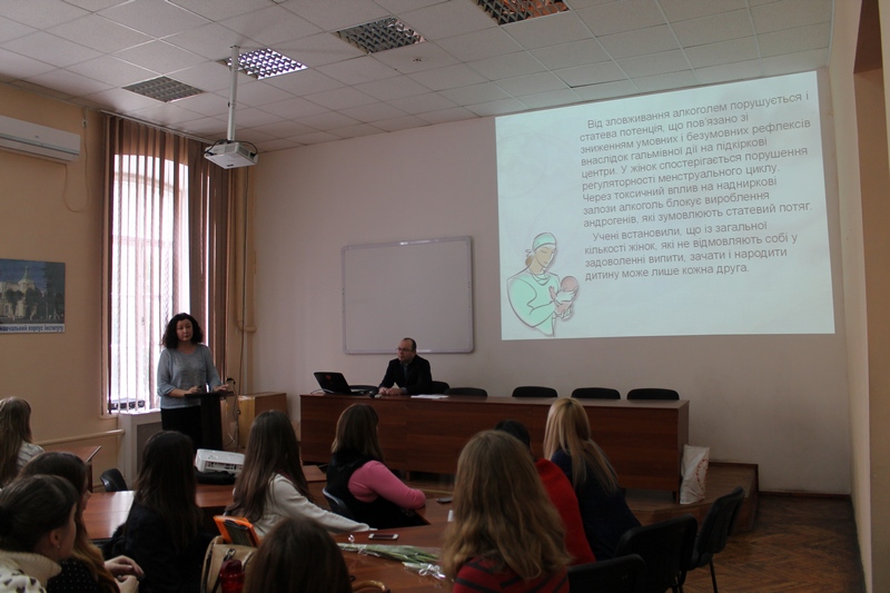 Оксана Богданівна розповіла про сучасні засоби контрацепції та важливість їх застосування, й продемонструвала презентацію на тему: «Репродуктивне здоров’я та контрацепція». Михайло Іванович показав презентацію на тему: «Репродуктивне здоров’я у підлітків», розповів про інфекції, які передаються статевим шляхом, симптоми хвороб та засоби попередження їх виникнення. Ірина Володимирівна продемонструвала презентацію щодо впливу алкоголю, наркотиків та тютюну на чолове та жіноче здоров’я. Спеціаліст зазначила, що ми несемо відповідальність за своє життя і свого покоління, тому відповідальність в першу чергу починається з нас. Зустріч була цікавою та пізнавальною. Студентам роздано роздатковий матеріал, який містить важливу та актуальну інформацію.