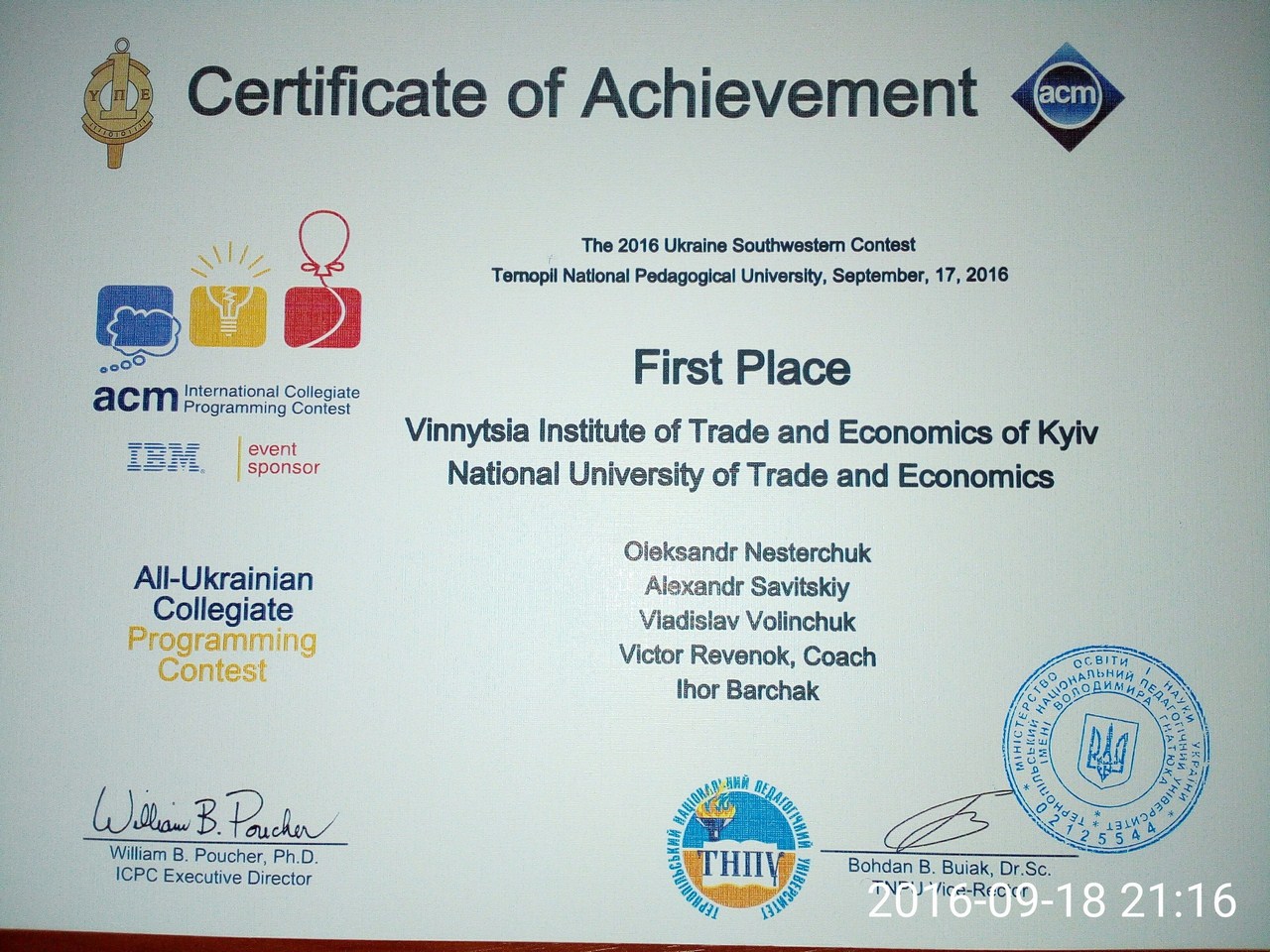 З 16 по 18 вересня 2016 року на базі Тернопільського національного педагогічного університету імені Володимира Гнатюка відбувся ІІ етап Всеукраїнської студентської олімпіади з програмування серед команд ВНЗ Південно-західного регіону України, який має статус 1/4 фіналу студентської командної першості світу з програмування АСМ-ІСРС 2016. Ця олімпіада є наймасовішою всесвітньою студентською олімпіадою і викликає величезний інтерес серед студентів, які спеціалізуються в сфері інформаційних технологій. Кожна команда складається з трьох учасників. Для вирішення 13 задач різної складності, викладених українською та англійською мовами, командам надається один комп’ютер і 5 годин без перерви.