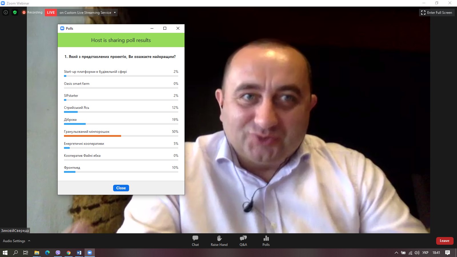 Неочікуваним моментом вебінару «Представлення інвестиційних проєктів та стартапів» стало те, що всі учасники вебінару проголосували за проект, ідея якого найбільше їм сподобалася. Після завершення голосування було оголошено переможця, ним став стартап «Гранульований мінпорошок».