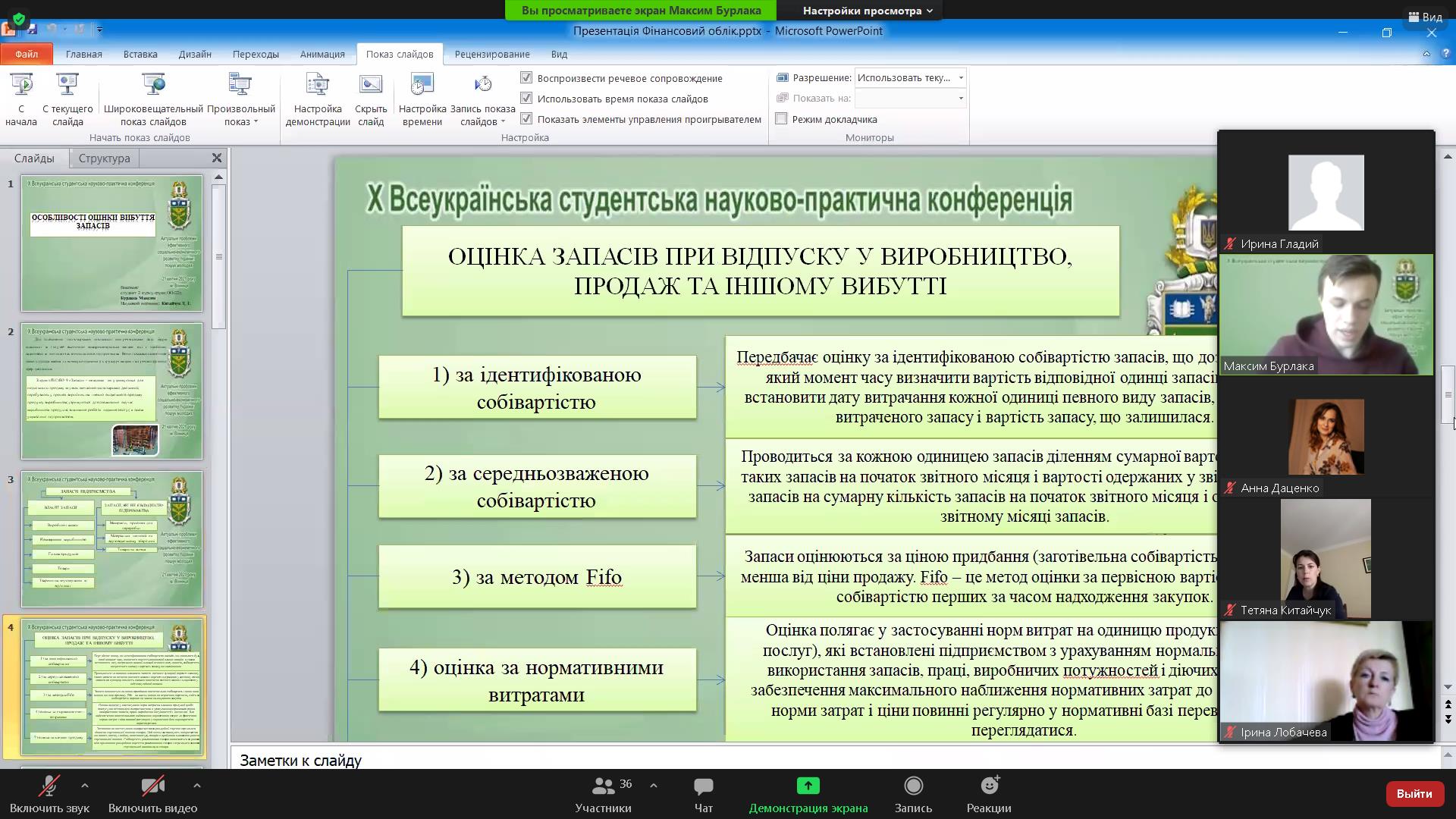 1. Бурлака Максим, студент групи ОО-22д – «Особливості оцінки вибуття запасів». Науковий керівник: к. е. н., доцент Китайчук Т. Г.