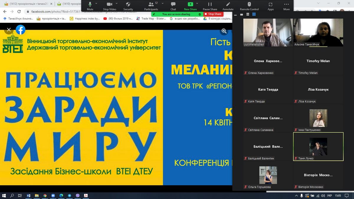 14 квітня 2022 року здобувачі вищої освіти та майбутні абітурієнти ВТЕІ ДТЕУ брали участь у засіданні Бізнес-школи ВТЕІ ДТЕУ, що проходило в форматі конференції у ZOOM.