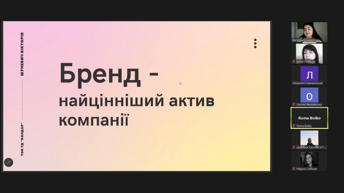 Пані Вікторія розповіла, чому бренд є найціннішим активом компанії, яку роль відіграє у впізнаваності, допомагає компанії вирізнятися на ринку, залучати нових клієнтів та збільшувати вартість, як саме це працює і яким чином бренд впливає на ключові показники ефективності (KPI). Лекція пройшла жваво. Зі сторони здобувачів вищої освіти було багато запитань, на які вони отримали вичерпні відповіді із прикладами практичних кейсів. Дякуємо Вікторії Шуневич за сучасну та корисну інформацію, яку здобувачі вищої освіти зможуть використати в рамках вивчення дисциплін освітньої програми «Маркетинг» та у своїй професійній діяльності.