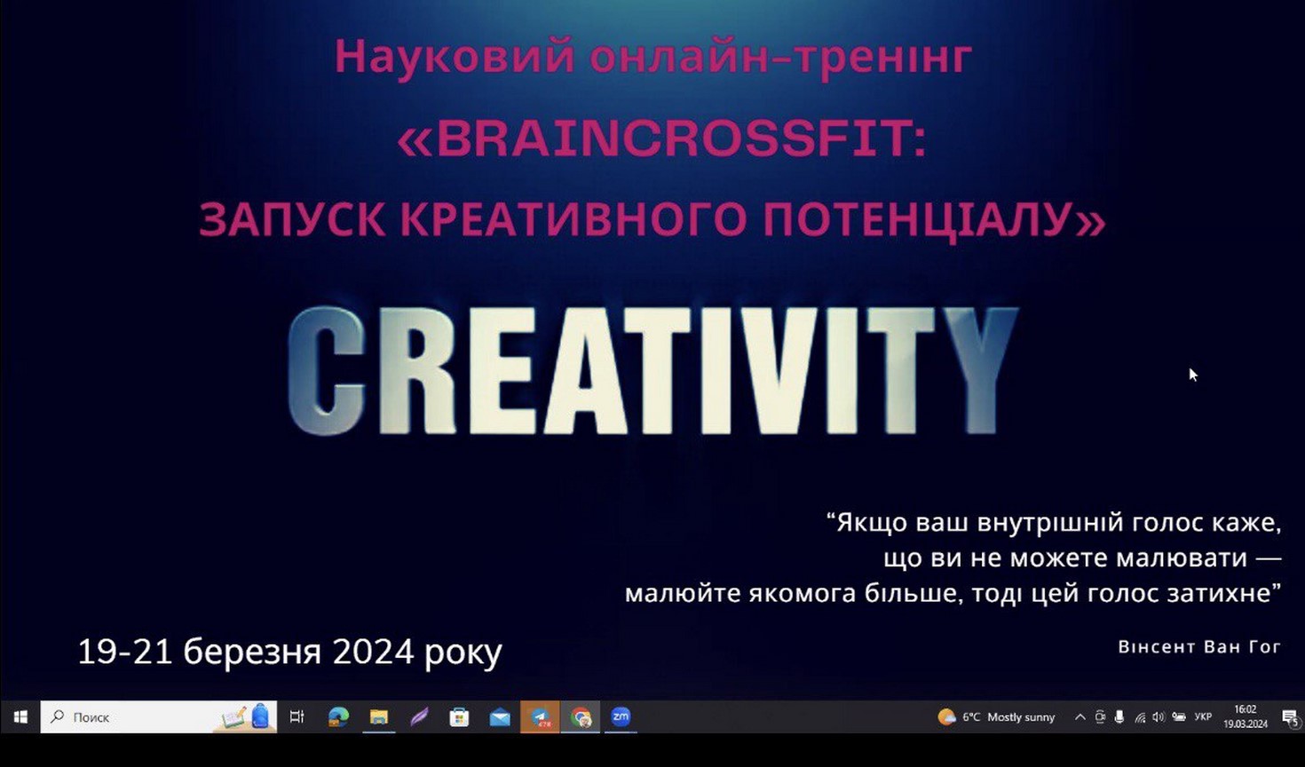Участь доцента кафедри маркетингу та реклами Оксани Якушевської у науковому онлайн-тренінгу «Braincrossfit: запуск креативного потенціалу»