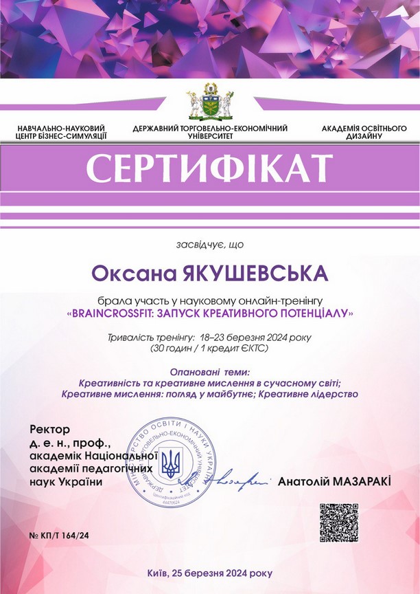 Розуміючи важливість розвитку таких якостей, доцент кафедри маркетингу та реклами Оксана ЯКУШЕВСЬКА, брала участь у науковому онлайн-тренінгу «Braincrossfit: запуск креативного потенціалу», організованому Навчально-науковим центром бізнес-симуляції Державного торговельно-економічного університету. Під час тренінгу учасники аналізували свій творчий потенціал, виконували практичні вправи та вчилися знаходити креативні і нестандартні рішення у пропонованих ситуаціях.