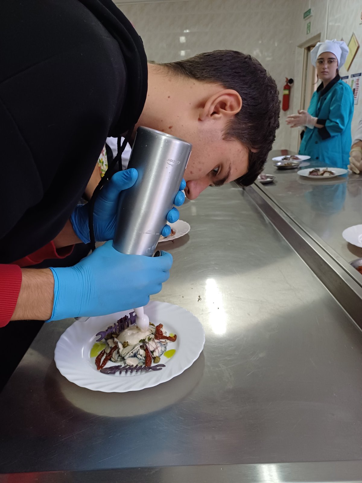 Дмитро поділився з присутніми своїм професійним досвідом, якого набув, працюючи у ресторанах Праги (Obecni Dum Prague), Дохи (La Cigale Hotel Doha, Катар), Києва, Івано-Франківська, Чернівців, Житомира. Шеф-кухар продемонстрував технологічний процес приготування страви власної розробки «Індючело шпронато», до складу якої входить рулет з індички SousVide, соус «Шпронато» на основі вершків зі шпротами, анчоусів та майонезу, чіпси тістові, маринована цибуля, каперси, в’ялені томати та мікрозелень червоної капусти у якості декору. Крім традиційних і знайомих усім інгредієнтів, у рецептуру напівфабрикатів входять також молекулярні текстури трансглютаміназа та ксантан, які надають виробам стабільної структури та гелеподібної консистенції. Для створення піни з соуса майстром використано кремер (сифон).