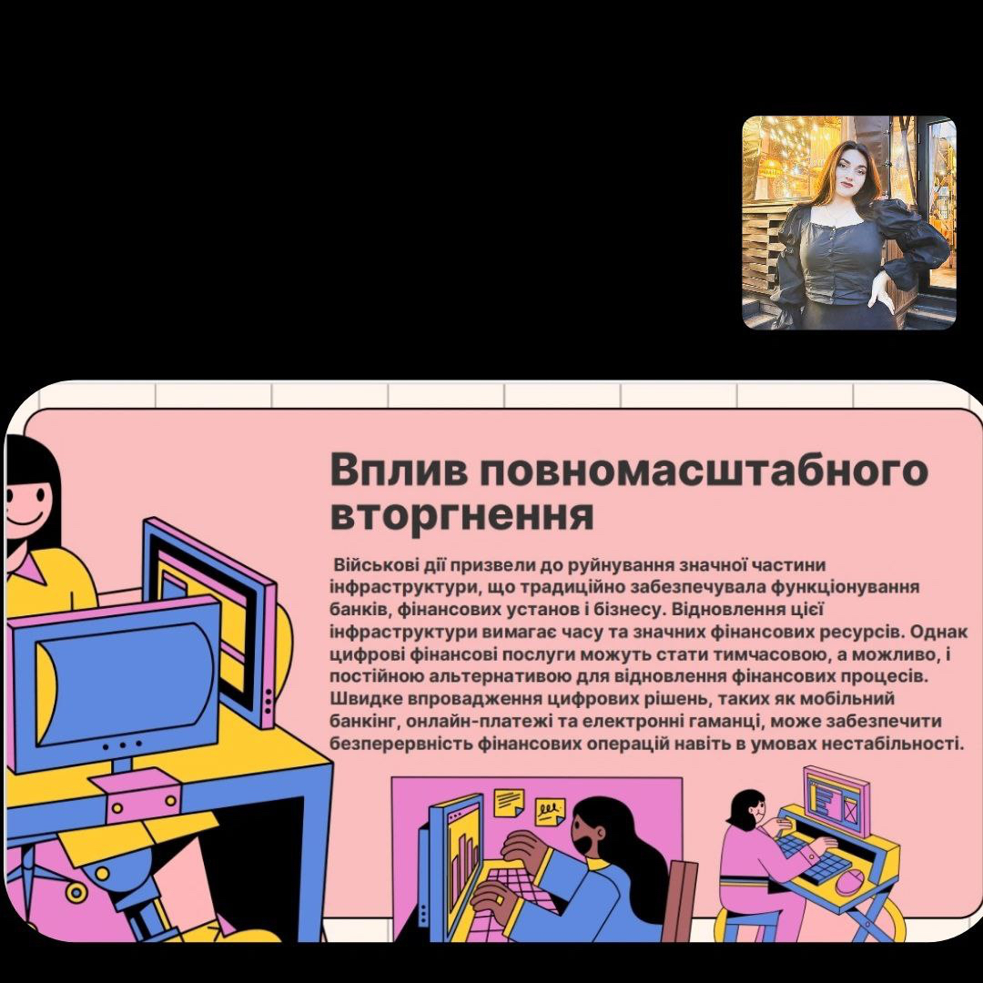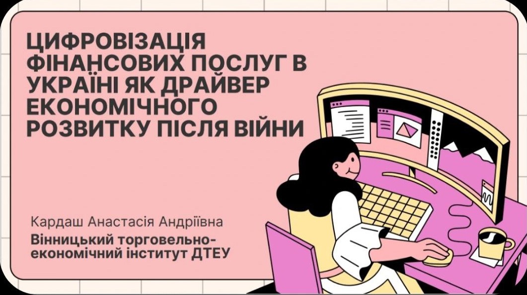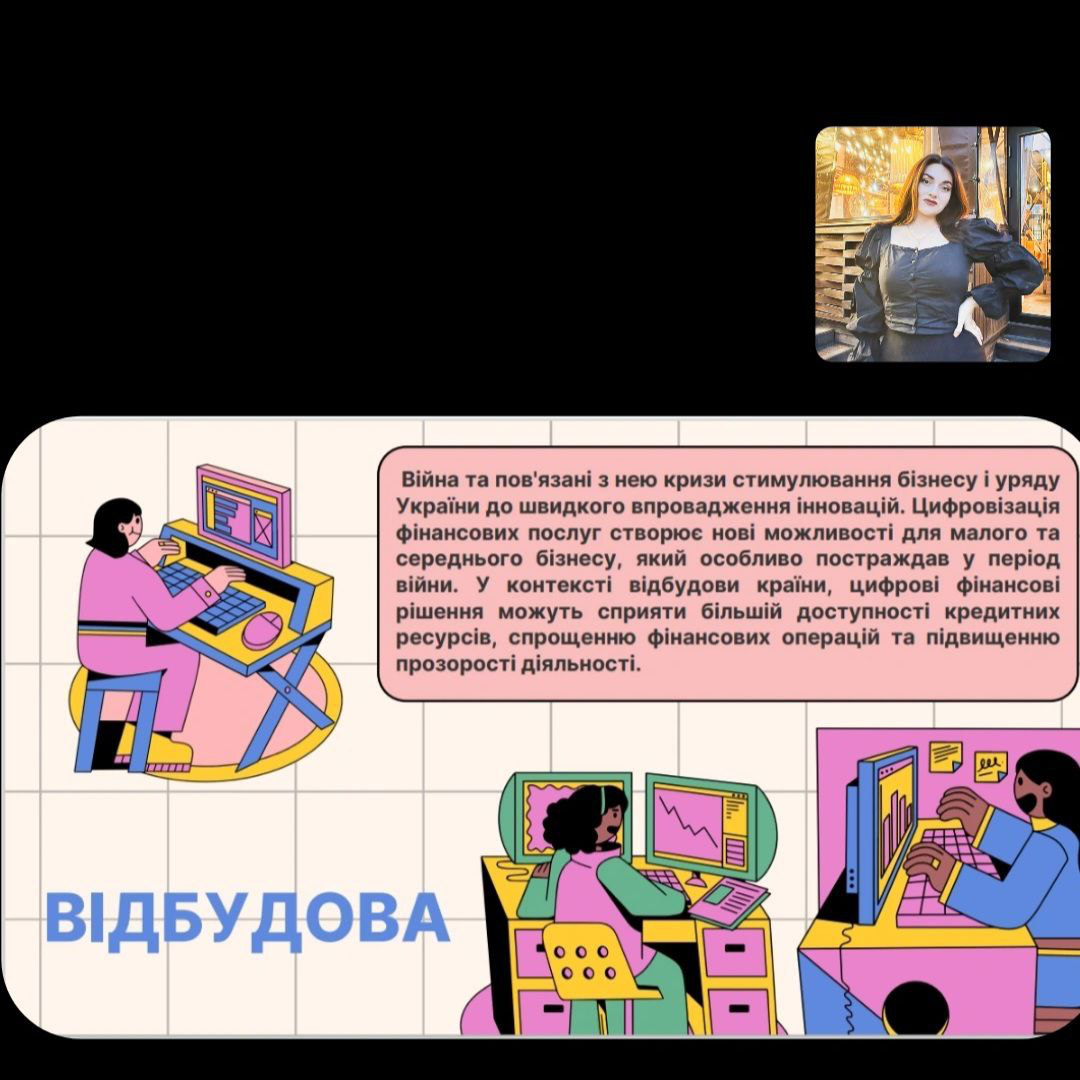 Студентка 3 курсу обрала актуальну тему «Цифровізація фінансових послуг в Україні як драйвер економічного розвитку після війни» та разом із науковим керівником Юлією Романовською провела дослідження потенціалу цифровізації у сфері фінансів. На конференції обговорили та підсумували результати наукових досліджень студентів закладів вищої освіти, що стосуються сучасних тенденцій і перспектив розвитку фінансово-кредитних систем.