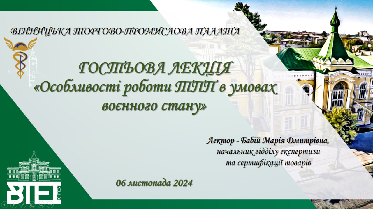 6 листопада 2024 року відбулась гостьова лекція для здобувачів вищої освіти груп ПТ-11д(м), ПТ-11д, ПТБД-31д на тему «Особливості роботи ТПП в умовах воєнного стану». Доповідачем на лекції виступила начальник відділу експертизи та сертифікації товарів Вінницької торгово-промислової палати Марія Бабій.