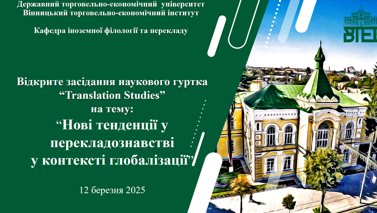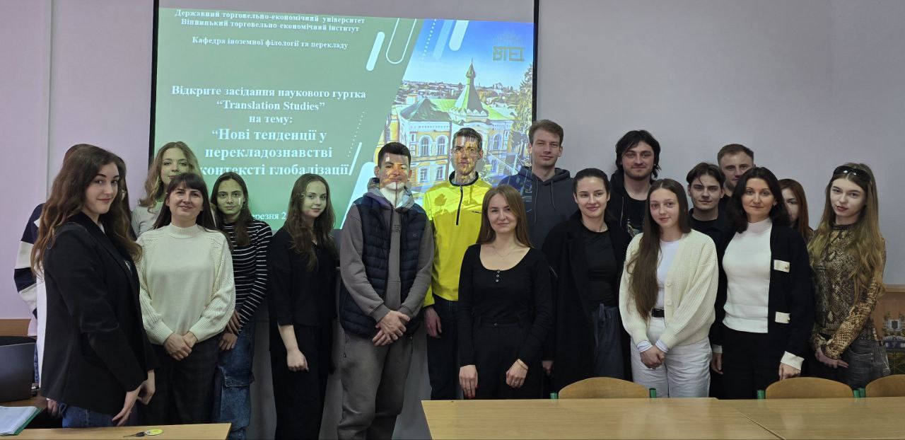 12 березня 2025 року кафедрою іноземної філології та перекладу Вінницького торговельно-економічного інституту ДТЕУ було проведено відкрите засідання наукового гуртка «Translation Studies» на тему «Нові тенденції у перекладознавстві у контексті глобалізації».