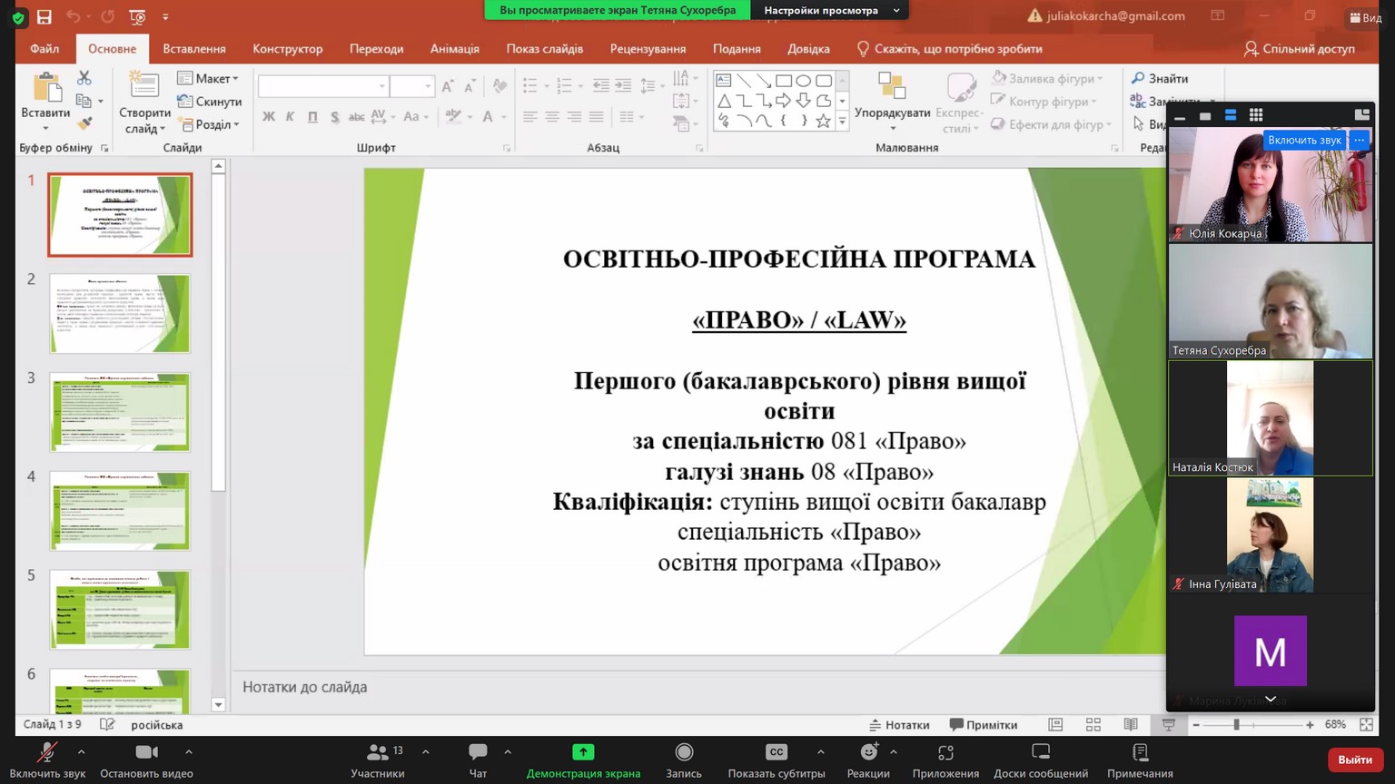 11 квітня 2024 року у змішаному форматі проведено обговорення безпосередніх аспектів підготовки фахівців освітніх програм першого та другого рівня вищої освіти «Право» за участі стейкголдерів, здобувачів вищої освіти, науково-педагогічних працівників кафедри права.