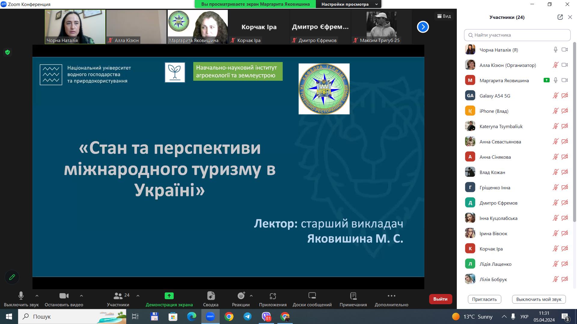 5 квітня 2024 року для здобувачів вищої освіти за спеціальністю 242 «Туризм» / «Туризм і рекреація» ОС «бакалавр», «магістр» у рамках вивчення освітніх компонентів «Міжнародний туризм», «Організація туризму» проведено гостьову лекцію на тему «Стан та перспективи міжнародного туризму в Україні», доповідачем на якій виступила старший викладач кафедри туризму та готельно-ресторанної справи Національного університету водного господарства та природокористування Маргарита Сергіївна Яковишина.