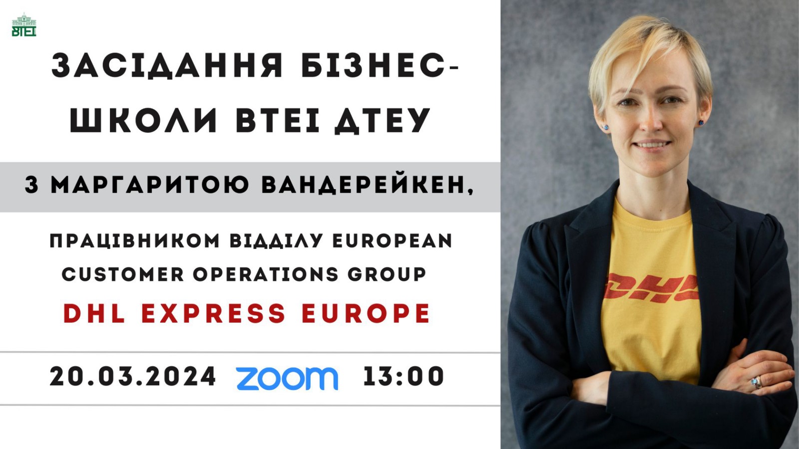 20 березня 2024 року слухачі Бізнес-школи ВТЕІ ДТЕУ брали участь в онлайн-зустрічі з Маргаритою Вандерейкен, представником відділу European Customer Operations Group DHL Express Europe. Ця зустріч стала чудовою можливістю для учасників дізнатися більше про одну з провідних логістичних компаній у світі.