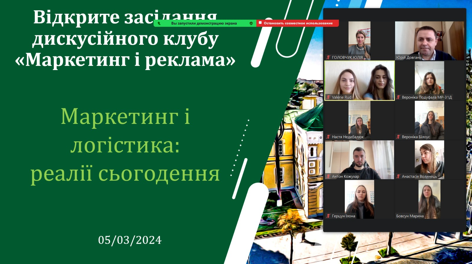 5 березня 2024 року в рамках проведення Фестивалю студентської науки на факультеті торгівлі, маркетингу та сфери обслуговування проведено відкрите засідання дискусійного клубу «Маркетинг та реклама» на тему «Маркетинг та логістика: реалії сьогодення». В засіданні дискусійного клубу взяли участь здобувачі ОС «бакалавр» та «магістр» освітніх програм «Маркетинг» і «Логістика» денної та заочної форм навчання, науково-педагогічні працівники кафедри маркетингу та реклами.