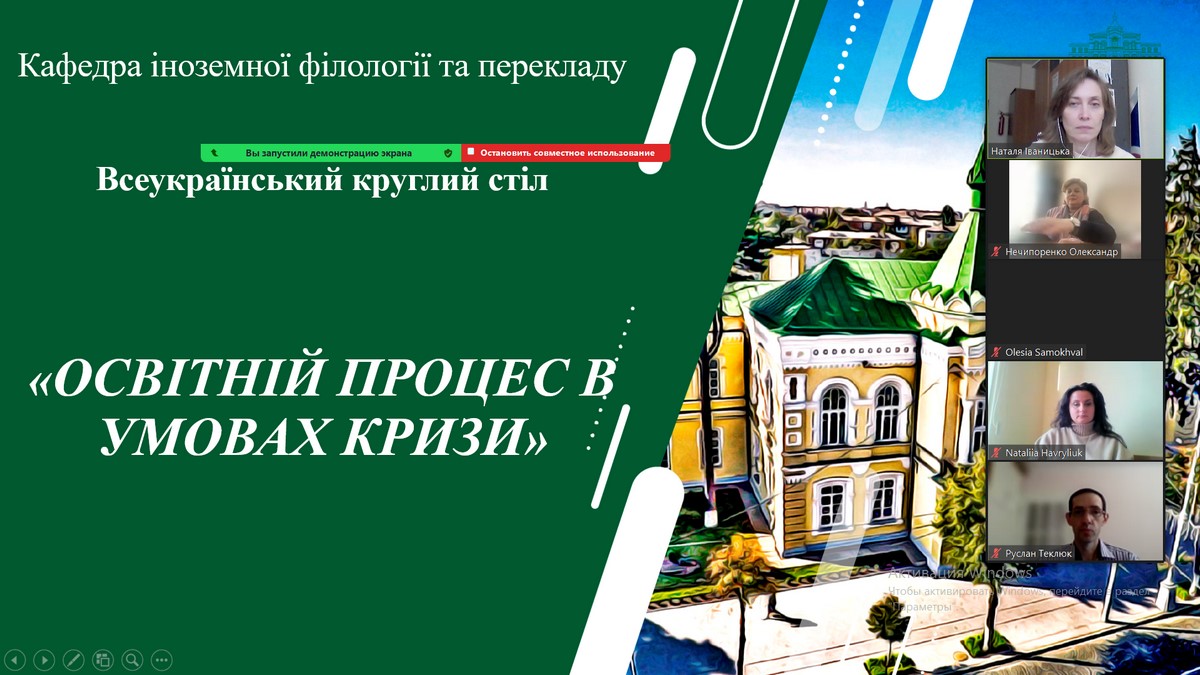 27 жовтня 2023 р. кафедра іноземної філології та перекладу провела Всеукраїнський круглий стіл «Освітній процес в умовах кризи». Викладачі кафедри та запрошені до участі представники інших ЗВО поділилися досвідом подолання навчальних втрат (learning loss) та прогалин у навчанні (learning gaps). Говорили про боротьбу з емоційним і професійним вигоранням. Розглянули питання формування навичок життєстійкості молоді в умовах кризи.