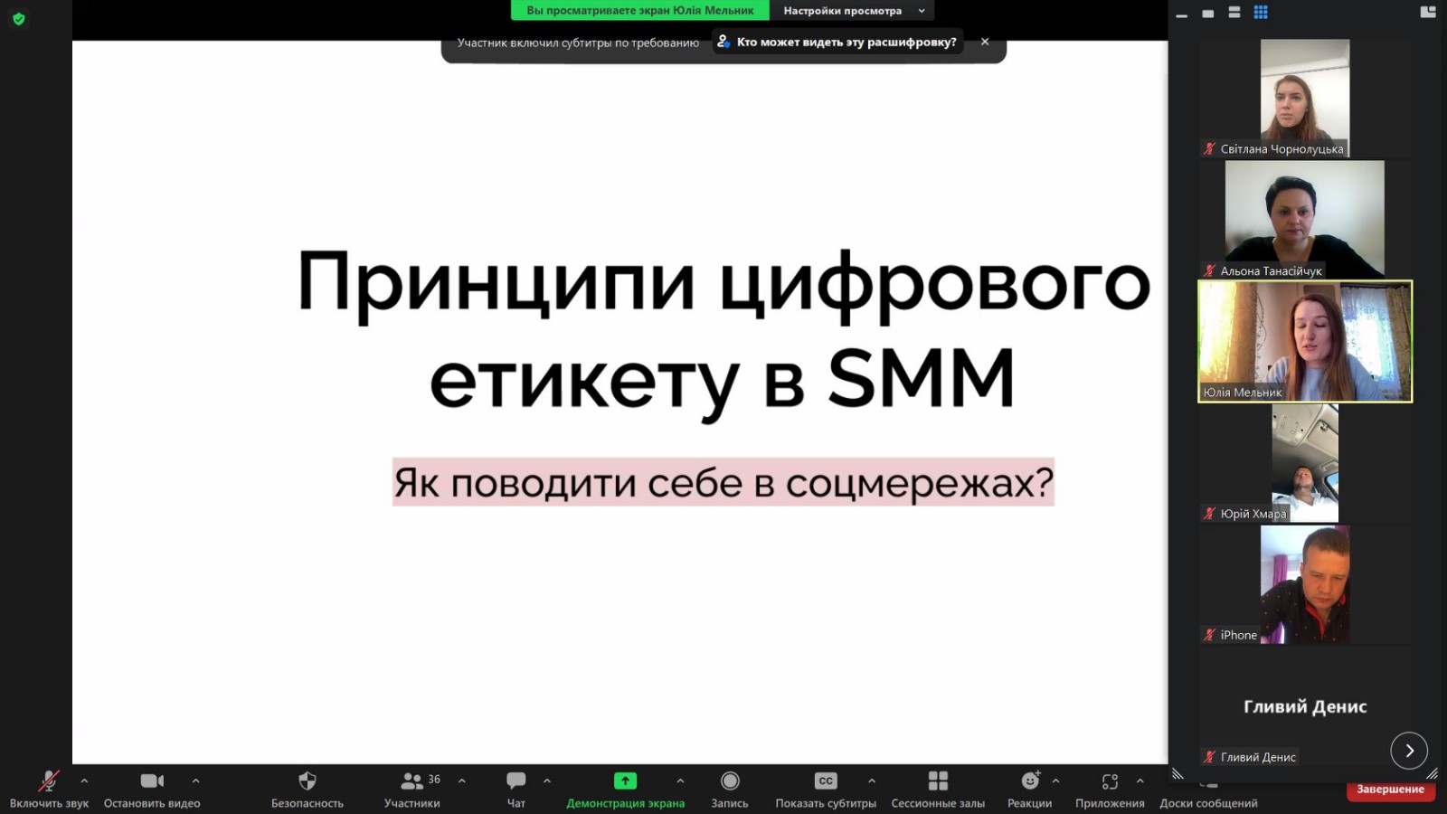 2 травня 2023 року для здобувачів вищої освіти спеціальності 075 «Маркетинг» (ОП «Маркетинг» ОС «магістр» та ОП «Маркетинг» ОС «бакалавр») відбулася зустріч з практикуючим SMM-маркетологом Юлією Мельник. Тема зустрічі: «Принципи цифрового етикету в SMM».