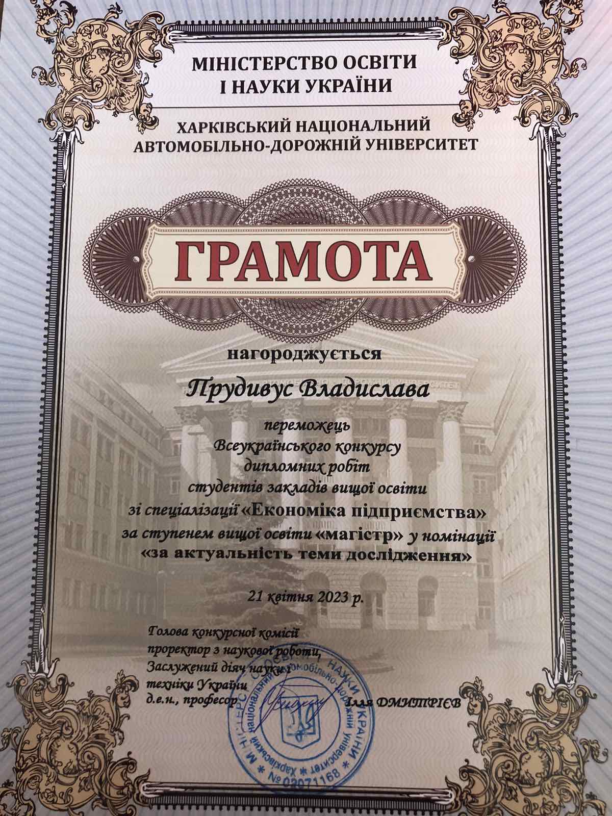 Здобувач ОС «магістр» спеціальності 051 «Економіка» ОП «Економіка підприємства» Прудивус Владислава, наразі вже випускниця кафедри економіки та міжнародних відносин (науковий керівник Валентина Хачатрян, доктор економічних наук, професор, завідувач кафедри економіки та міжнародних відносин) здобула перемогу Всеукраїнському конкурсі дипломних робіт студентів закладів вищої освіти зі спеціалізації «Економіка підприємства». Бажаємо успішної кар’єри та пишаємося талановитими випускниками!