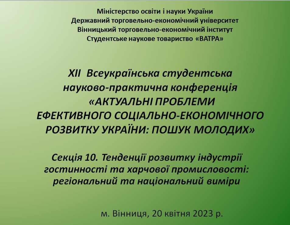 20 квітня 2023 року у Вінницькому торговельно-економічному інституті ДТЕУ відбулась XІІ Всеукраїнська студентська науково-практична конференція «Актуальні проблеми ефективного соціально-економічного розвитку України: пошук молодих». У роботі конференції активну участь взяли студенти Вінницького торговельно- економічного інституту ДТЕУ, інших ЗВО. Доповідачами виступили студенти Житомирського національного університету імені Івана Франка, Одеського торговельно-економічного фахового коледжу, Чернівецького торговельно-економічного інституту ДТЕУ.