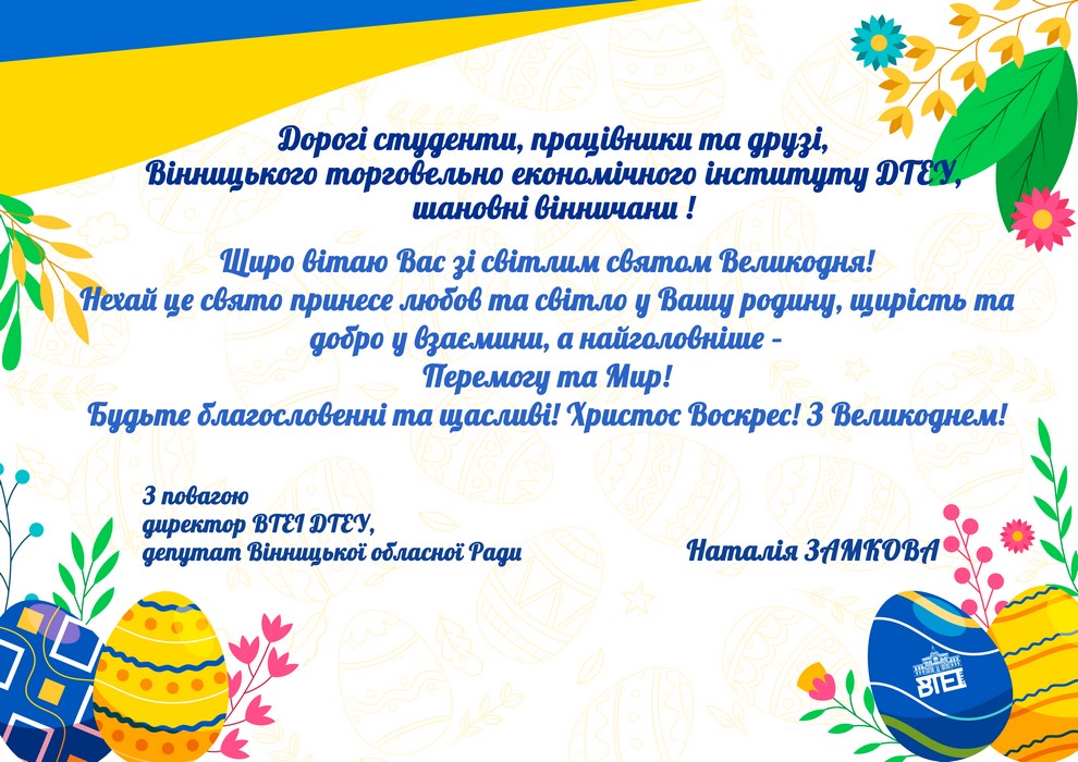 Світлі і радісні дні Христового Воскресіння знову приходять на землю України, одвічні, як людське прагнення до гармонії, краси, радості і миру. Це світле і добре свято несе з собою віру, надію і любов, які нам усім дуже необхідні.