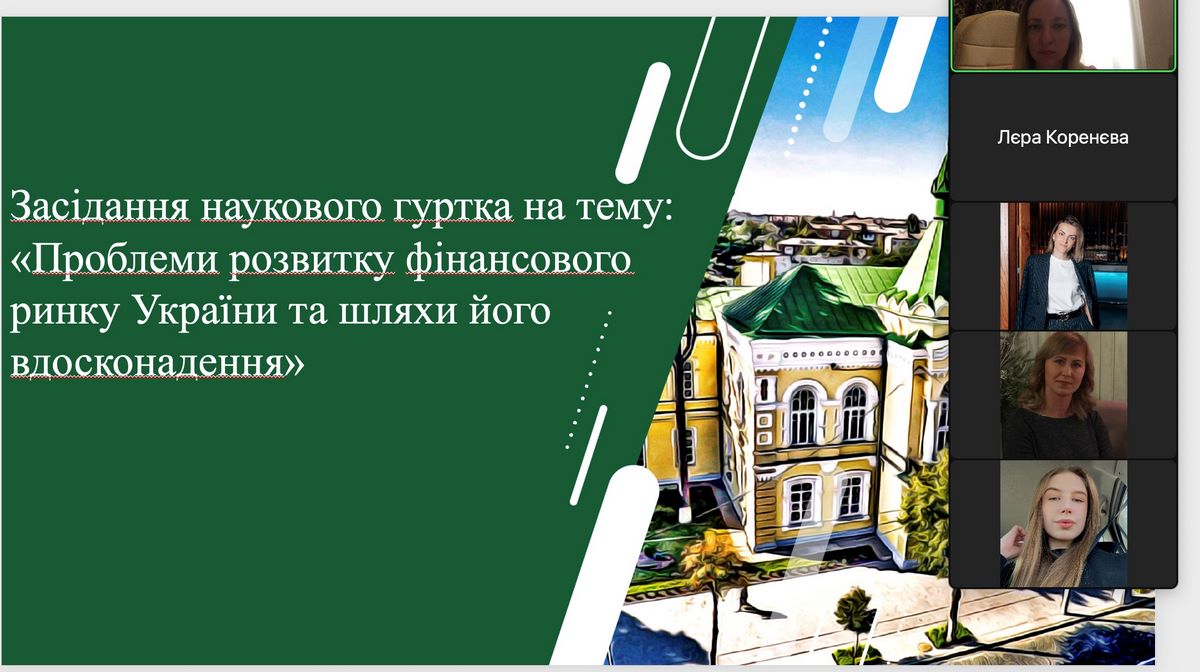 12 квітня 2023 року відбулося засідання наукового гуртка на тему «Проблеми розвитку фінансового ринку України та шляхи його вдосконадення», студенти доповідали на актульні теми, а саме Мовчан Діана «Пріоритетні вектори реформування фінансового сектору у післявоєнний період», Людковська Юлія «Вплив воєнного стану на фондовий ринок України», Тодчук Тетяна «Фінансовий ринок України в євроінтеграційних процесах», Антонюк Тетяна «Зарубіжний досвід відновлення фінансових ринків після ресеції». Засідання наукового гуртка відбувалося в жвавій дискусії, задавалися актуальні питання та обгрунтовувались відповіді.