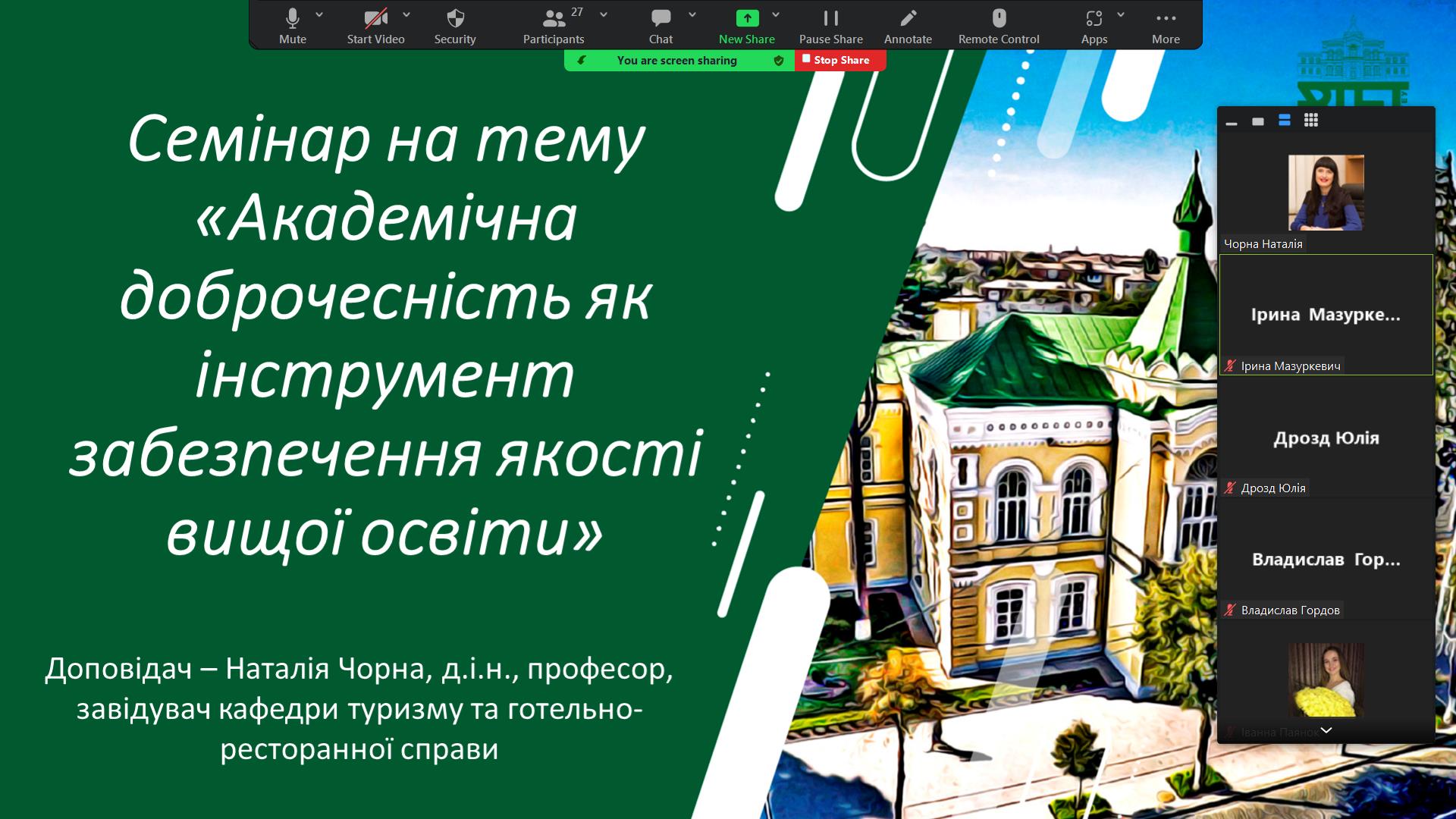 12 квітня 2023 року для здобувачів вищої освіти за спеціальностями 181 «Харчові технології» (ОП «Ресторанні технології»), 241 «Готельно-ресторанна справа» (ОП «Готельно-ресторанна справа»), 242 «Туризм» (ОП «Міжнародний туристичний бізнес») ОС «магістр», д.і.н., професором, завідувачем кафедри туризму та готельно-ресторанної справи Наталією Чорною було проведено семінар на тему «Академічна доброчесність як інструмент забезпечення якості вищої освіти».