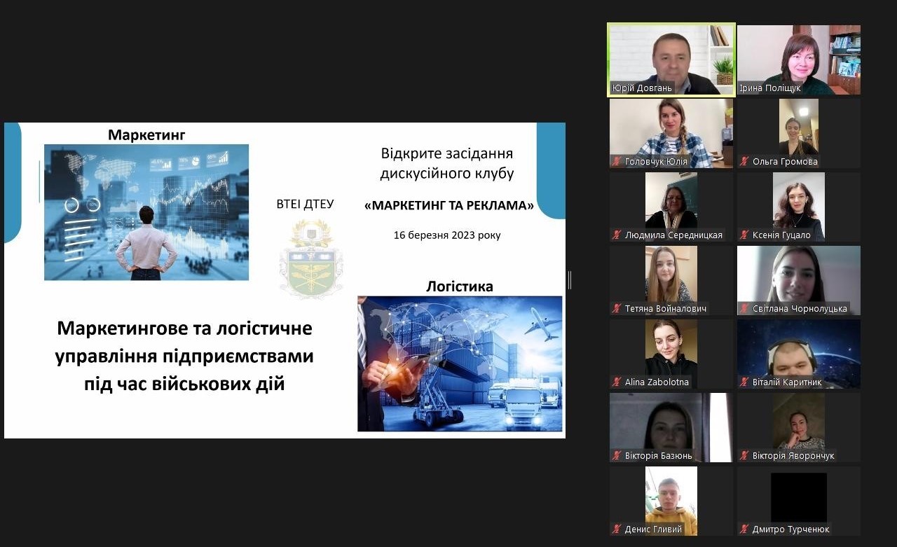16 березня 2023 року в рамках проведення ХІ Фестивалю студентської науки відбулося відкрите засідання дискусійного клубу «Маркетинг та реклама» на тему «Маркетингове та логістичне управління підприємствами під час військових дій».