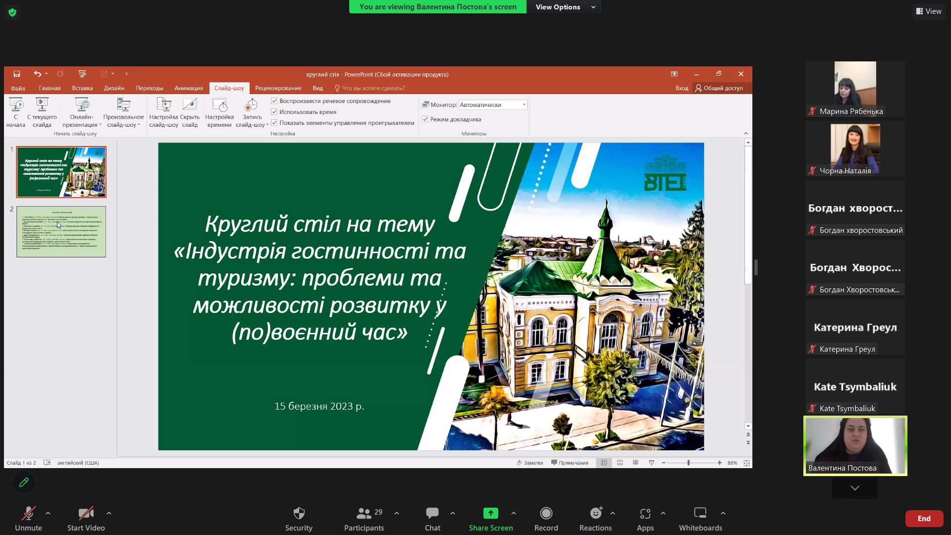 15 березня 2023 року у рамках ХІ Фестивалю студентської науки кафедрою туризму та готельно-ресторанної справи було проведено круглий стіл на тему «Індустрія гостинності та туризму: проблеми та можливості розвитку у (по)воєнний час».