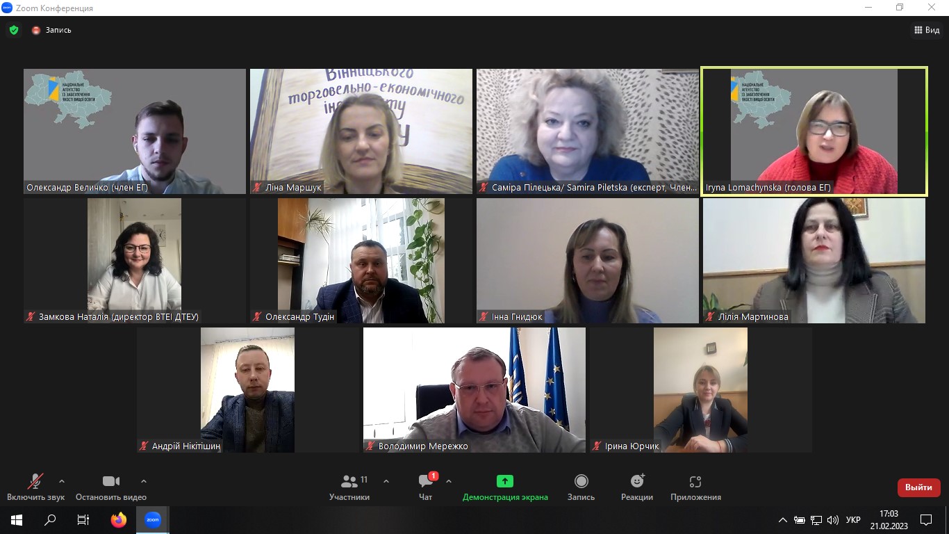 З 20 по 22 лютого 2023 року у Вінницькому торговельно-економічному інституті ДТЕУ проходила акредитаційна експертиза освітньої програми «Фінанси банківська справа та страхування» спеціальності 072 «Фінанси банківська справа та страхування» освітнього ступеня «молодший бакалавр». Процедура пройшла згідно з узгодженою програмою роботи експертної групи Національного агентства із забезпечення якості вищої освіти. Зустрічі відбулись у дистанційному режимі на платформі Zoom із експертною групою, до складу якої входили Ломачинська Ірина (керівник групи), Пілецька Саміра, Величко Олександр та гарантом освітньої програми «Фінанси банківська справа та срахування» Маршук Ліною, керівництвом інституту на чолі із Замковою Наталією.