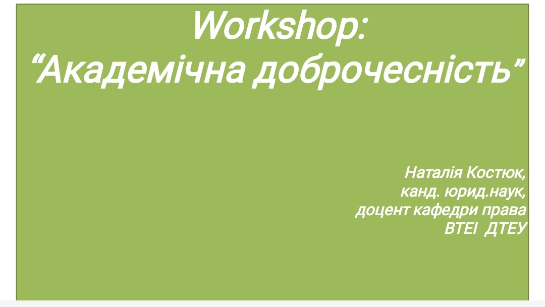 31 жовтня 2022 року гарантом освітньої програми «Право» доц. Н. Костюк було проведено правовий Workshop «Академічна доброчесність». Було запропоновано для розгляду нормативно-правове забезпечення впровадження принципів академічної доброчесності у Вінницькому торговельно-економічному інституті ДТЕУ. Учасники Workshop говорили про те, як дотримання доброчесності впливає на якість освіти, про важливість дотримання академічної доброчесності як науково-педагогічними працівниками, так і здобувачами вищої освіти, про необхідність формування культури дотримання академічної доброчесності у Вінницькому торговельно-економічному інституті ДТЕУ.