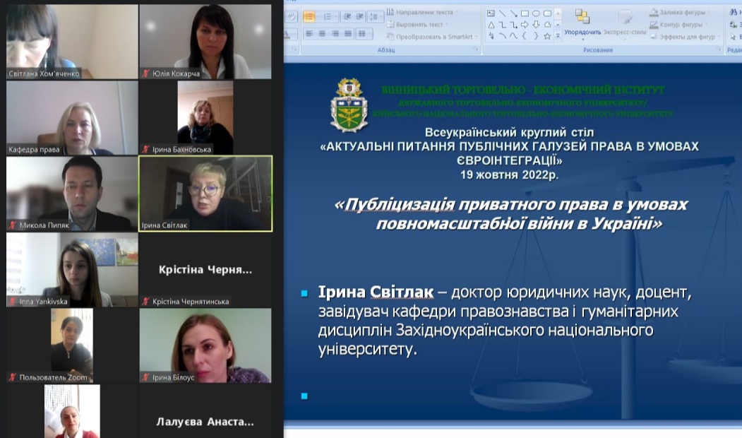19 жовтня 2022 кафедрою право проведено Всеукраїнський круглий стіл на тему «Актуальні питання публічних галузей права в умовах євроінтеграції». Під час круглого столу учасники обговорили та проаналізували проблемні питання трансформаційних процесів у розвитку публічних галузей права, нові реалії захисту прав і свобод громадян України та зміни в трудовому законодавстві під час дії правового режиму воєнного стану, зміни в правилах перетину кордону під час воєнного стану тощо.
