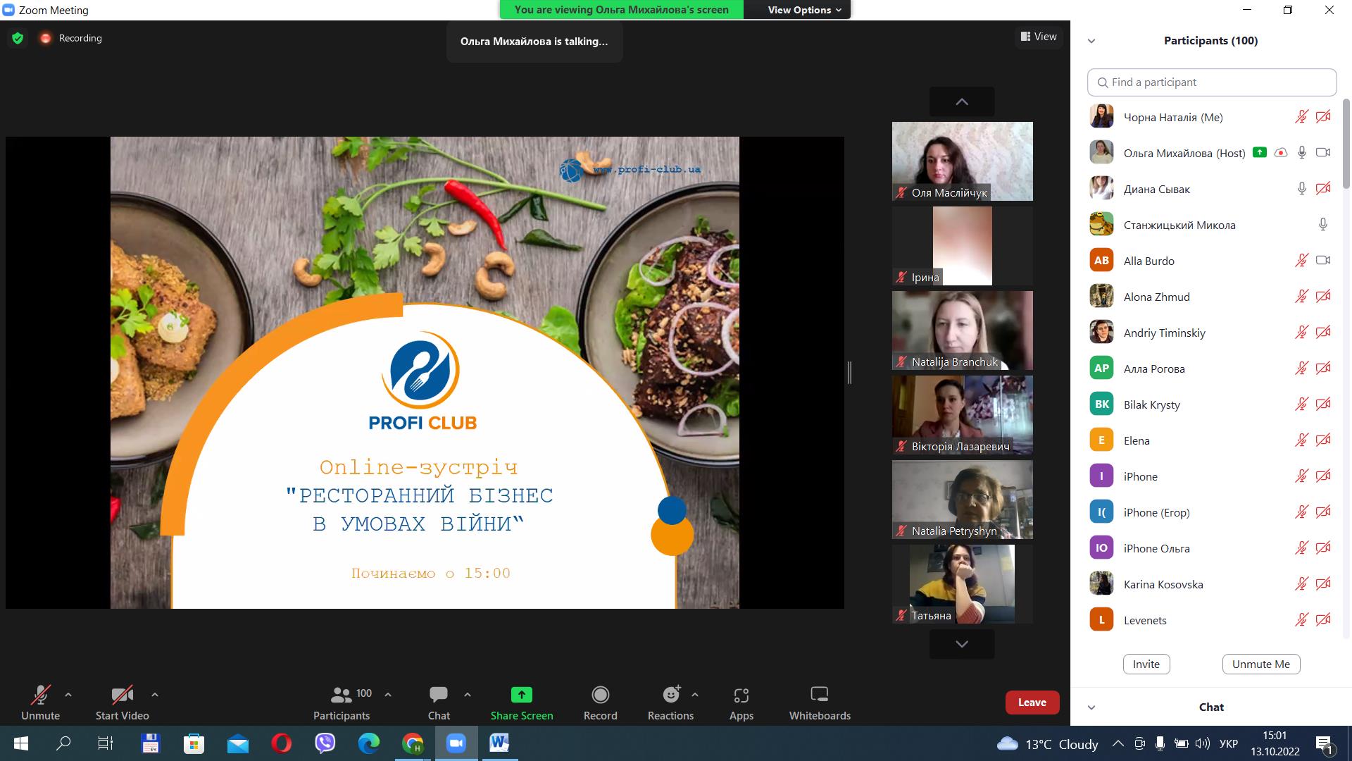 13 жовтня 2022 року науково-педагогічні працівники кафедри туризму та готельно-ресторанної справи та здобувачі вищої освіти за спеціальністю «Готельно-ресторанна справа» долучилися до онлайн-зустрічі «Ресторанний бізнес в умовах війни», організованої навчальним центром «PROFI CLUB».