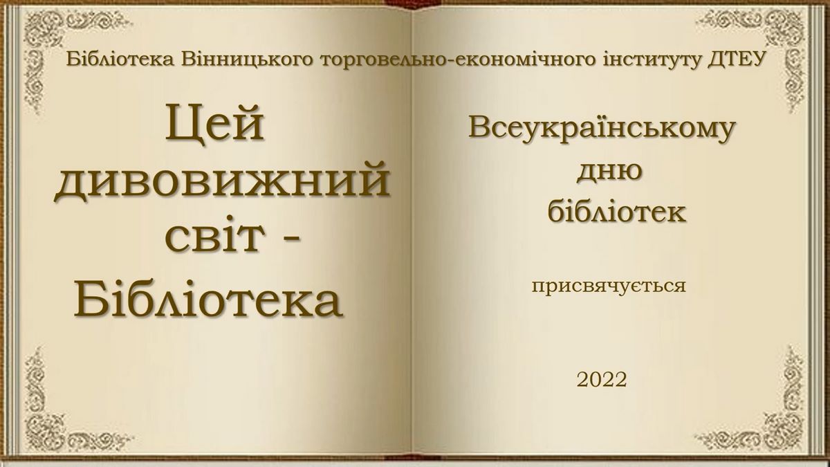 Бібліотекою ВТЕІ ДТЕУ було підготовлено інформаційний калейдоскоп “Цей дивовижний світ - Бібліотека”. Запрошуємо до перегляду.