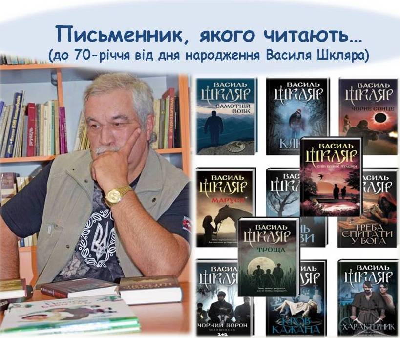 10 червня 2021 року виповнюється 70 років від дня народження Василя Шкляра – найвідомішого сучасного українського письменника. Письменник, якого читають, люблять, поважають, адже кожна його книга – це бестселер. Його по праву називають «українським динамітом» за гостросюжетність, динамізм, драматизм. Твори в. Шкляра – абсолютно різні, самобутні, контрастні. Сам письменник вважає, що кожна книга має свій власний простір і переконаний, що різноманіття – це велика перевага. Єдине, що завжди зберігається в книжках Василя Шкляра – власний неповторний стиль, адже письменник стає впізнаваним саме за цим фактором. Письменник є автором таких відомих романів як «Ключ», «Кров кажана», «Чорний ворон», «Маруся», «Характерник», «Троща» та інші. Він є лавреатом багатьох премій у царині літератури: «Золоте перо», «Золоті письменники України», «Спіраль століть», Національної премії імені Тараса Шевченка, і це – ще не повний перелік.