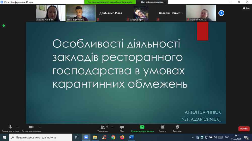 11 березня 2021 року кафедрою туризму та готельно-ресторанної справи було організовано семінар на тему: «Особливості діяльності закладів ресторанного господарства в умовах карантинних обмежень», доповідачем на якому виступив операційний директор бару-сидерії «Білий налив» Антон Зарічнюк.