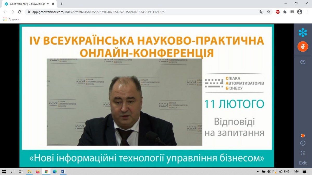 11 лютого 2021 року викладачі кафедри економічної кібернетики та інформаційних систем та студенти спеціальності 126 «Інформаційні системи та технології» освітньої програми «Інформаційні технології у бізнесі» освітніх ступенів «молодший бакалавр» та «бакалавр» Вінницького торговельно-економічного інституту КНТЕУ взяли участь у роботі IV Всеукраїнської науково-практичної онлайн-конференції «Нові інформаційні технології управління бізнесом», яку вже традиційно організує та проводить Всеукраїнська Спілка Автоматизаторів Бізнесу.