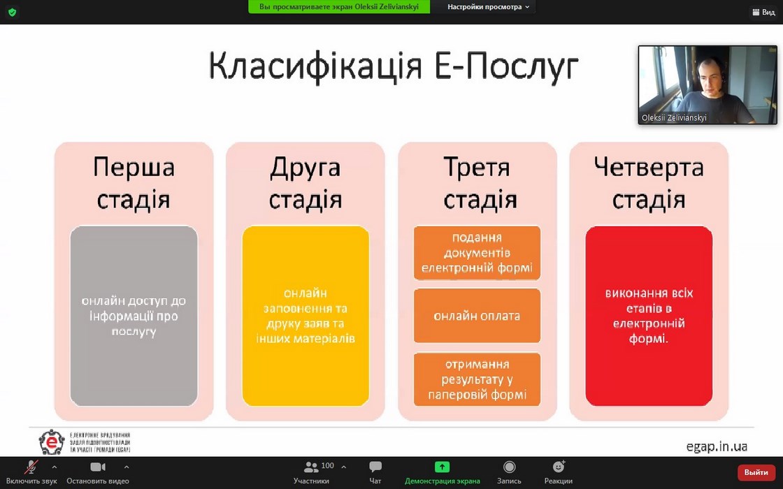 18 листопада 2020 року кафедрою менеджменту та адміністрування спільно з кафедрою економічної кібернетики та інформаційних систем в рамках діяльності наукової студії «Цифрова трансформація в громадах» (керівник – доцент Ніколіна І.І.) для здобувачів спеціальностей «Публічне управління та адміністрування» та «Інформаційні системи та технології» було організовано онлайн-лекцію «Архітектура е-сервісів в Україні. Впровадження електронних державних послуг». Спікером заходу було запрошено координатора компоненту «Е-послуги» Програми «Електронне урядування задля підзвітності влади та участі громади» (Програма EGAP) Олексія Зелів’янського, а модератором виступив Іван Копиченко, регіональний координатор програми EGAP в Одеській області.