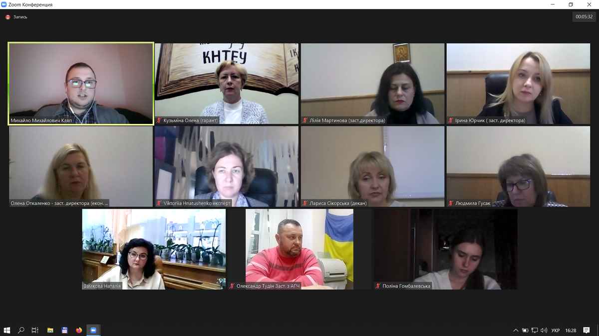 Експертна група у складі Кляпа Михайла Михайловича (голова), Гнатушенко Вікторії Володимирівни та Гомбалевської Поліни Андріївни провела робочі зустрічі з керівництвом інституту, гарантом освітньої програми, завідувачем кафедри економічної кібернетики та інформаційних систем (випускової для ОП «Інформаційні технології у бізнесі»), керівниками структурних підрозділів, науково-педагогічними працівниками, членами Ради студентського самоврядування інституту/факультету, здобувачами вищої освіти, які навчаються за ОП, та роботодавцями.